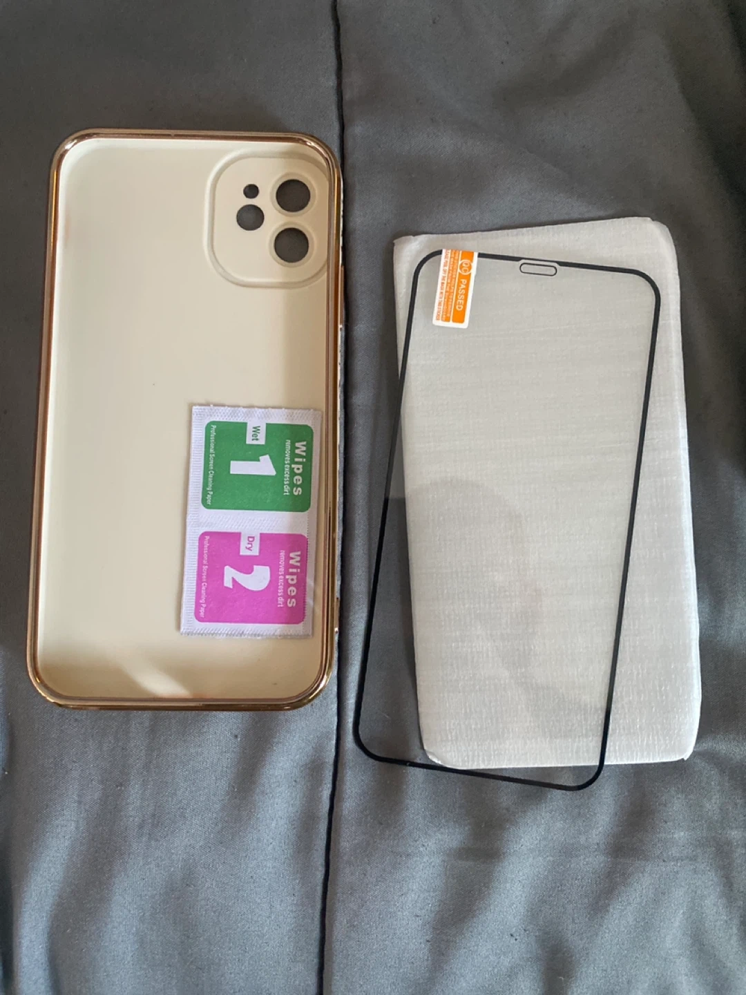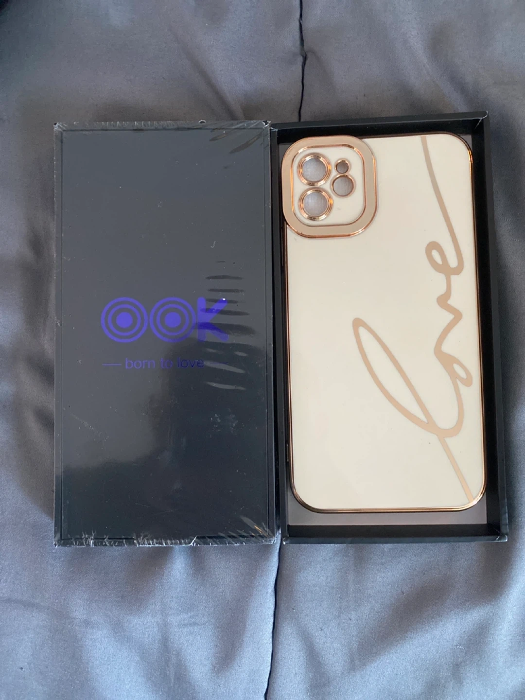 Selling a brand new iPhone 11 case! It's a lovely cream color with gold accents. The case is in its original box and comes with screen cleaning wipes and a screen protector. It features a cute 'love' design on the back. Perfect for keeping your phone safe and stylish!