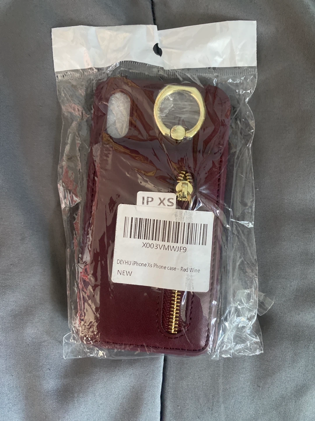 I'm selling a brand new DEYHU iPhone Xs phone case in a beautiful red wine color! It comes in its original packaging. This stylish case features a unique zipper design and a convenient ring holder for added grip and functionality