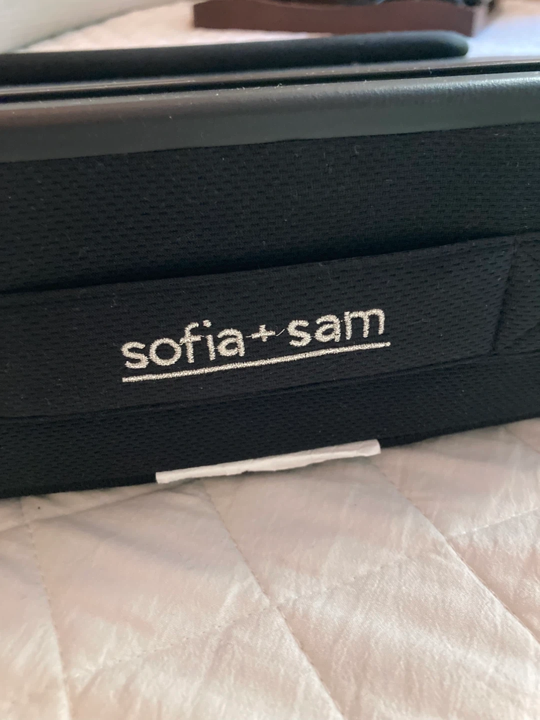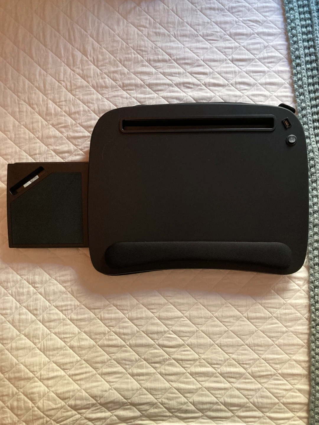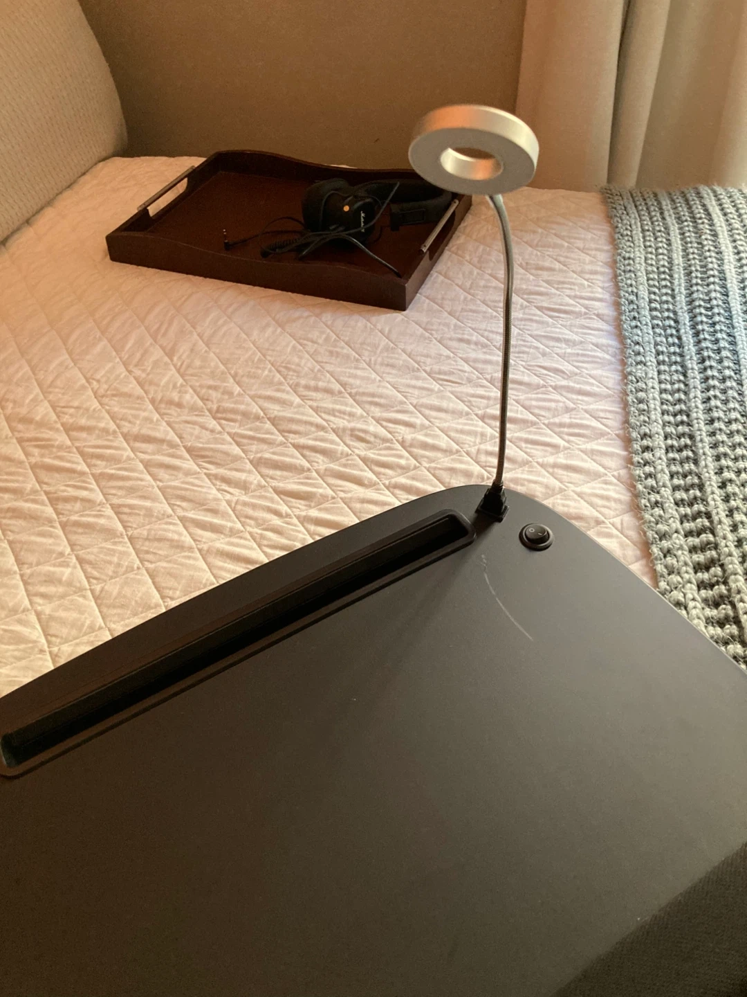 Includes a USB light, a place to prop your smartphone up, a texturized spot for drinks or notes, and a comfortable underside that rests on the legs.