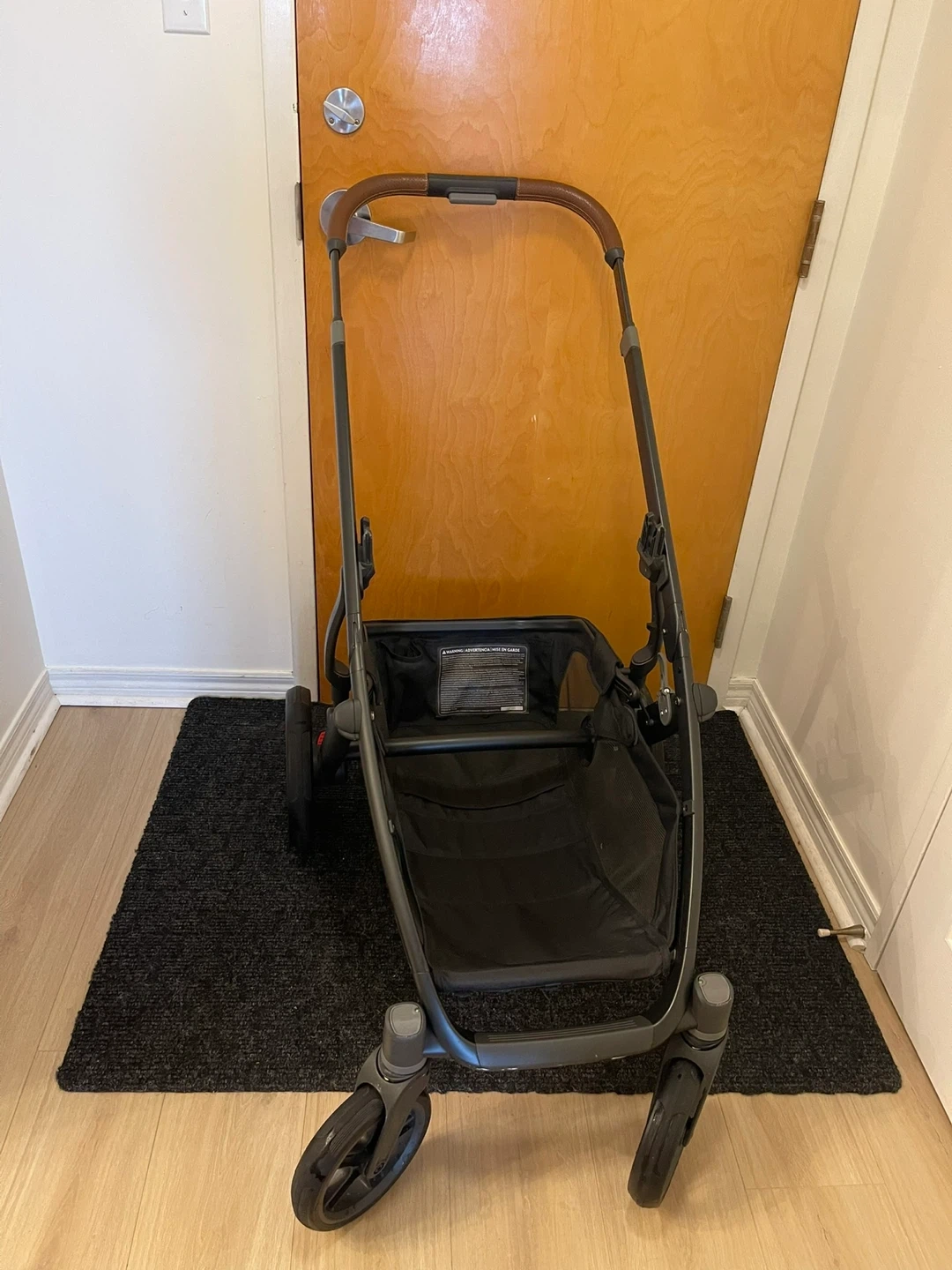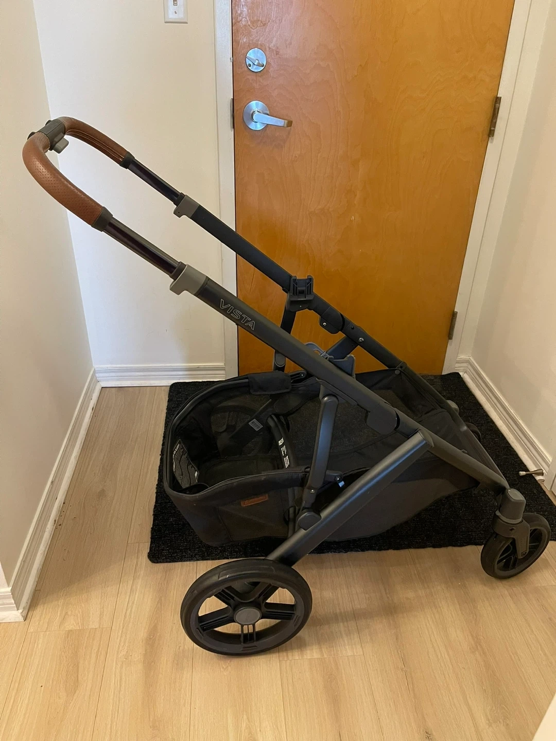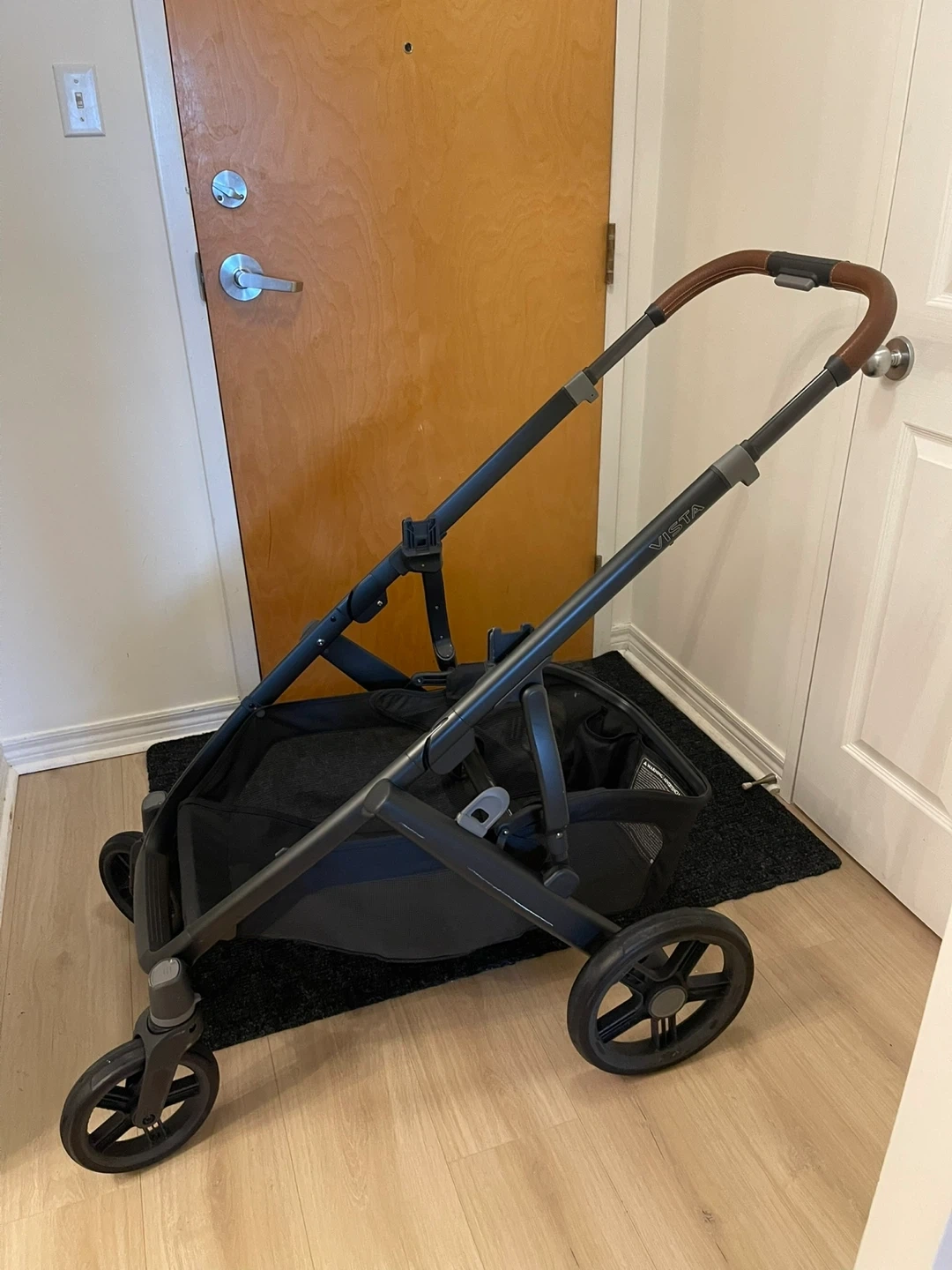 Selling a UPPAbaby Vista stroller frame in Carbon Frame/Saddle Leather. It's in good condition and ready for its next family. Perfect for navigating city streets or park trails! It's a reliable and sturdy stroller.