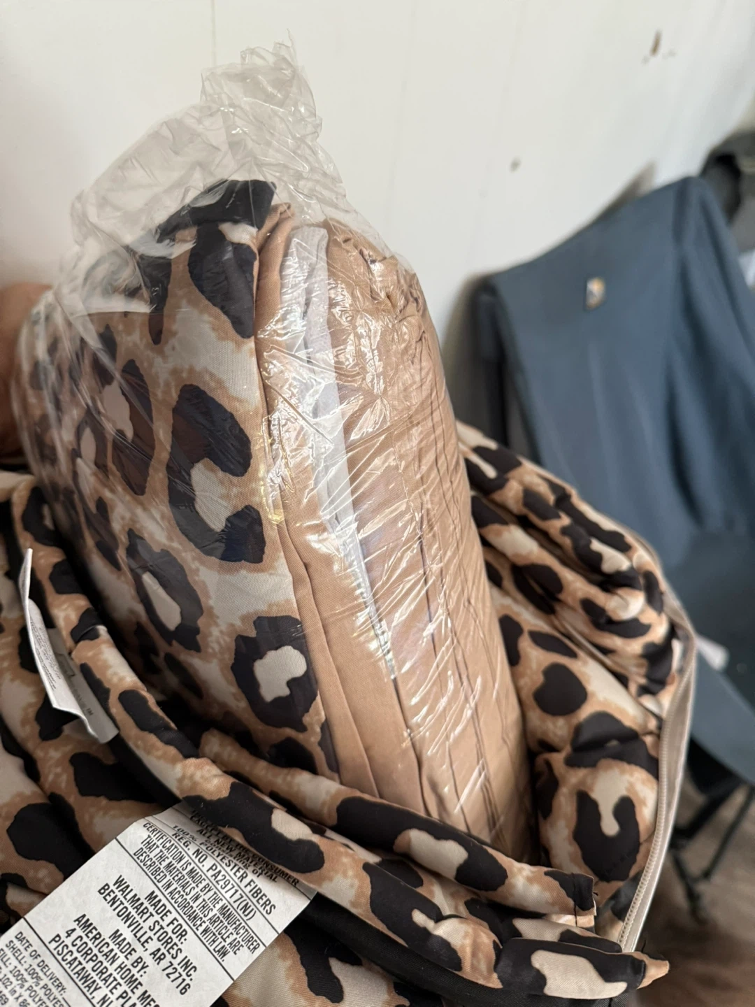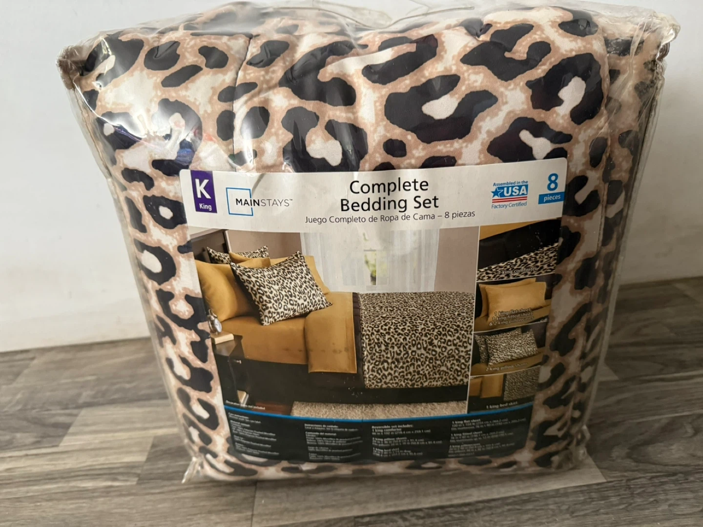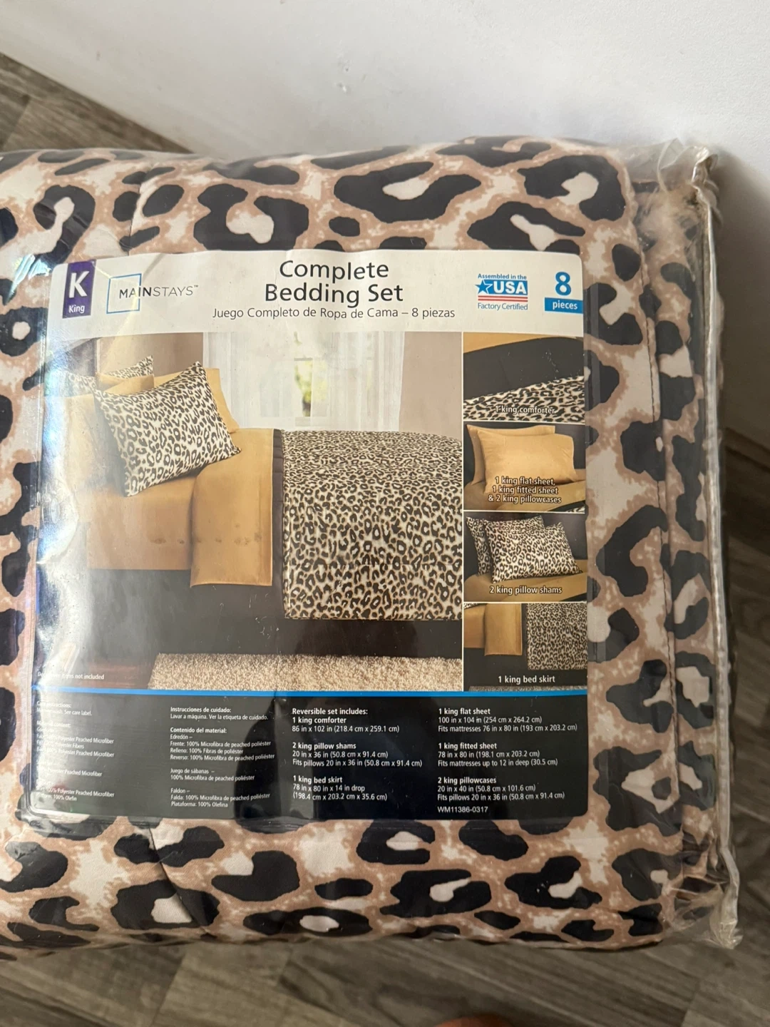 Selling a brand new Mainstays King Complete Bedding Set in a fun leopard print! This set includes 8 pieces to give your bedroom a stylish makeover. The set is still in its original packaging and has never been used. Perfect for adding a touch of wildness to your decor!