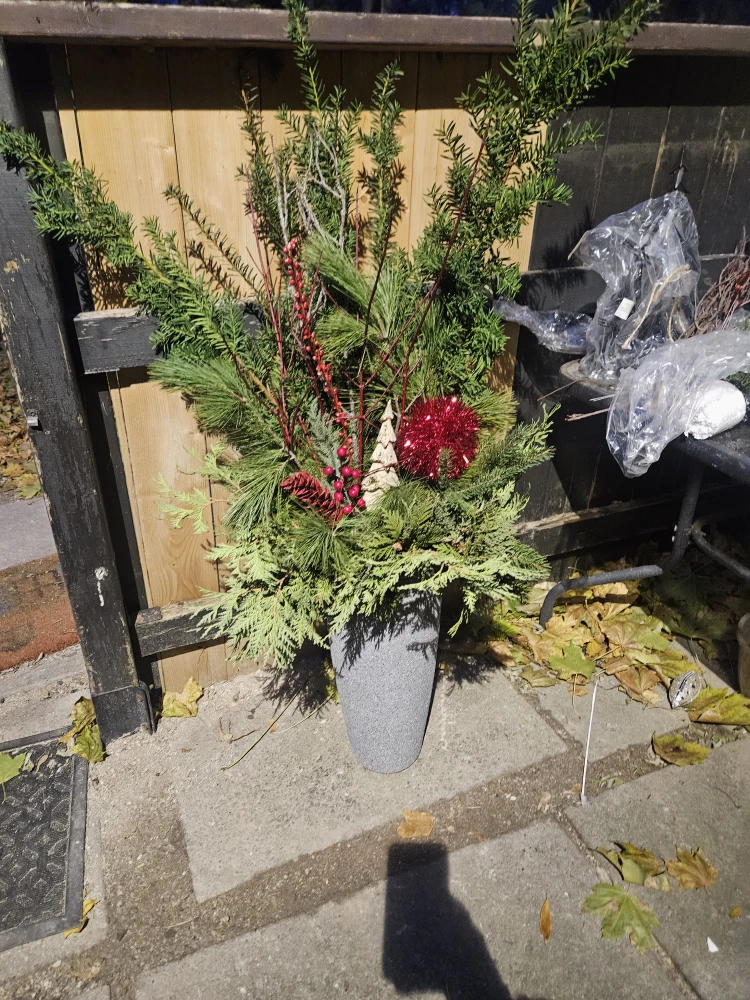 I have an outdoor winter planter for sale. It's perfect for adding a touch of seasonal cheer to your porch or garden! It's in great condition and ready to brighten up your outdoor space
