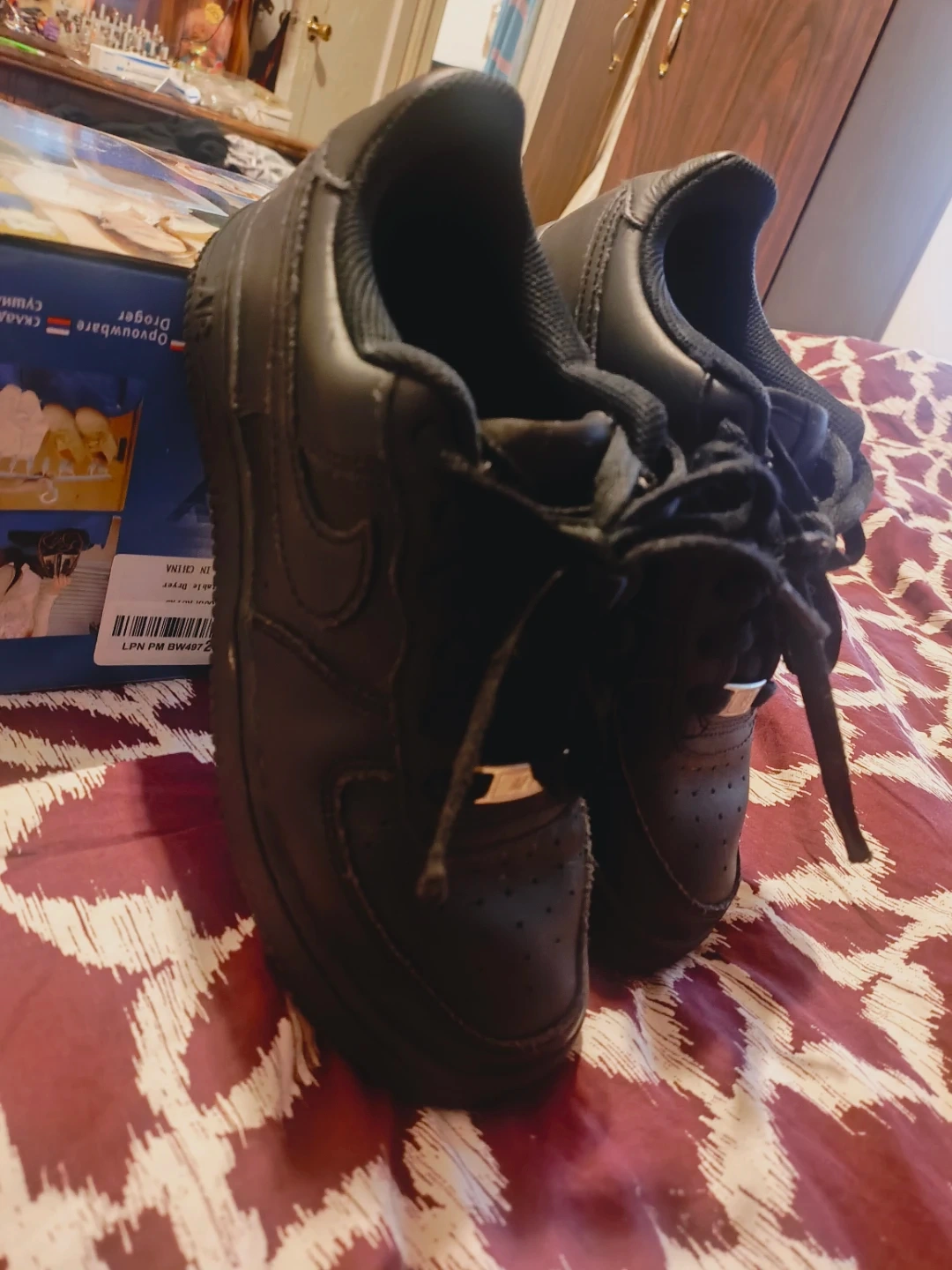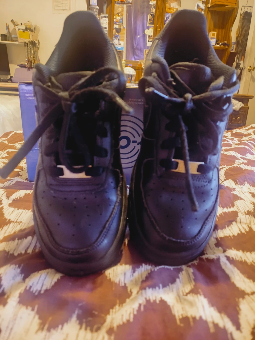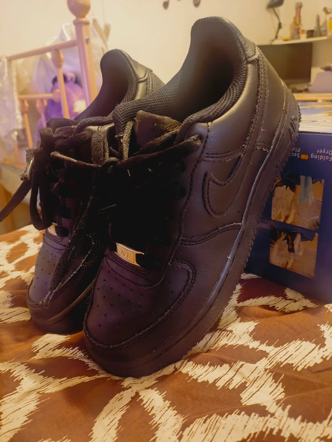 Selling a pair of black Nike Air Force 1s. They have some signs of wear but overall they're in good condition and ready for a new owner!