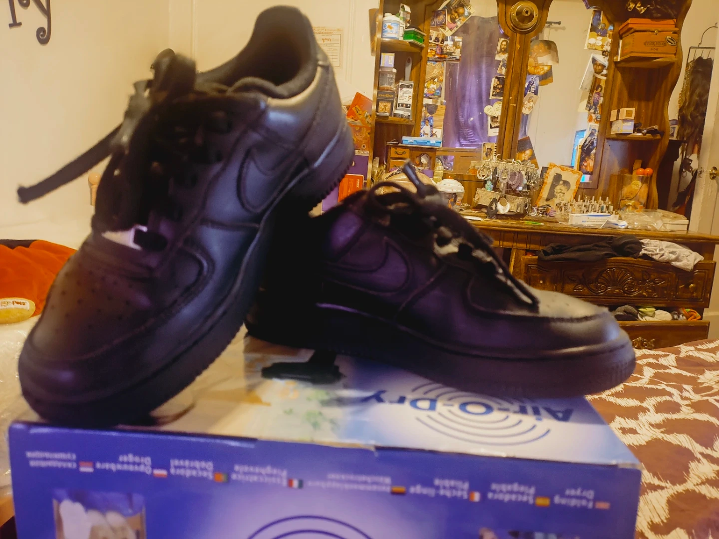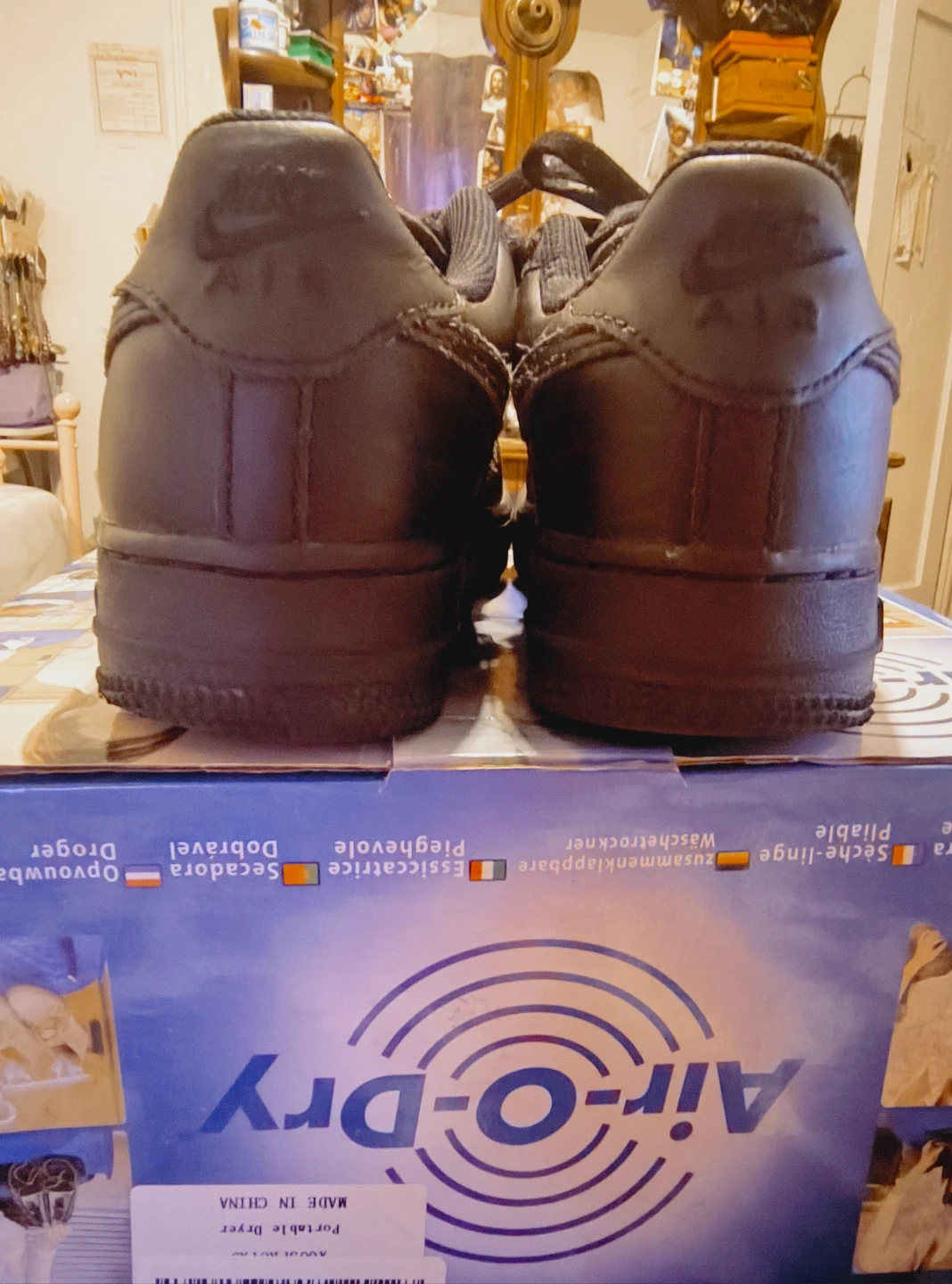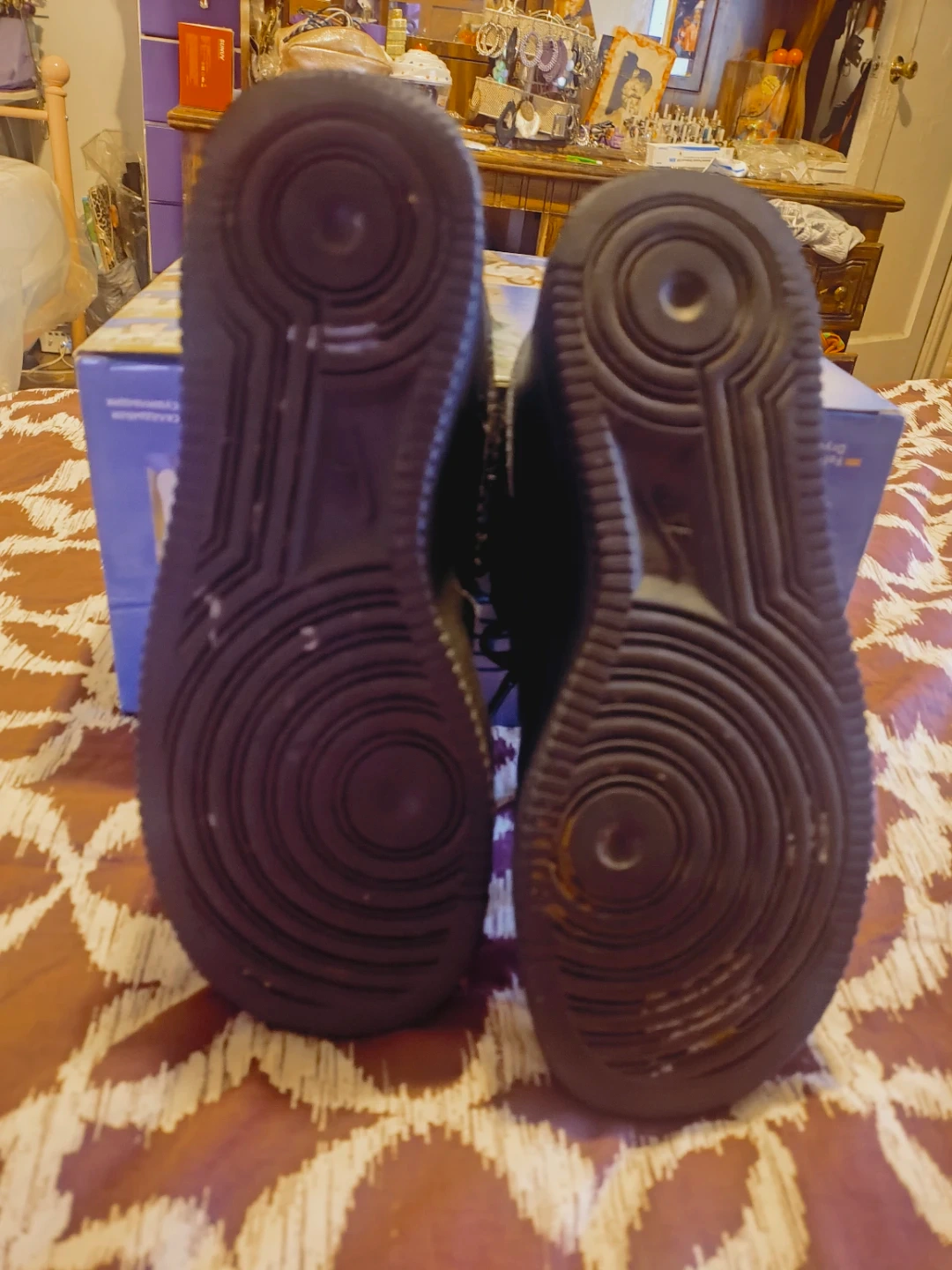 Selling a pair of black Nike Air Force 1s. They have some signs of wear but overall they're in good condition and ready for a new owner!
