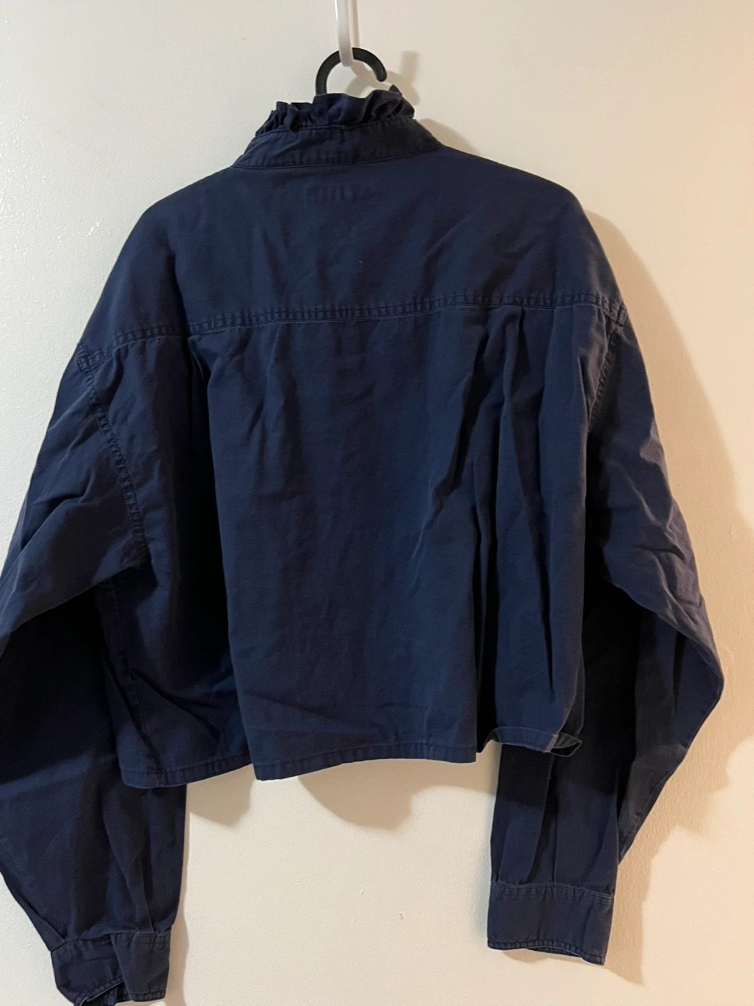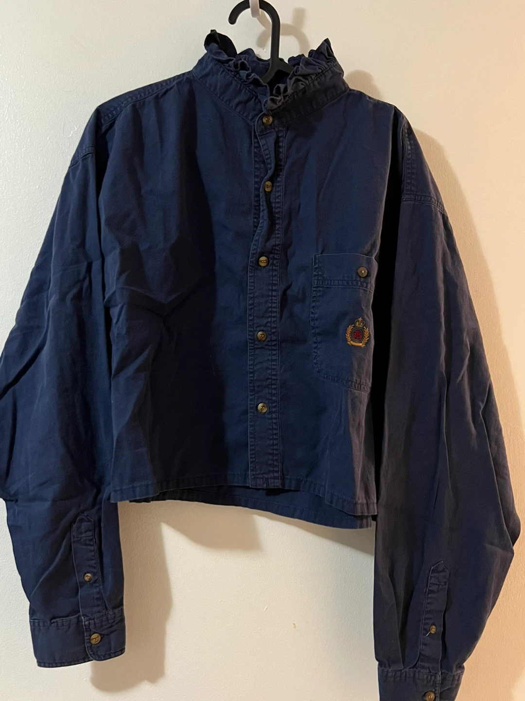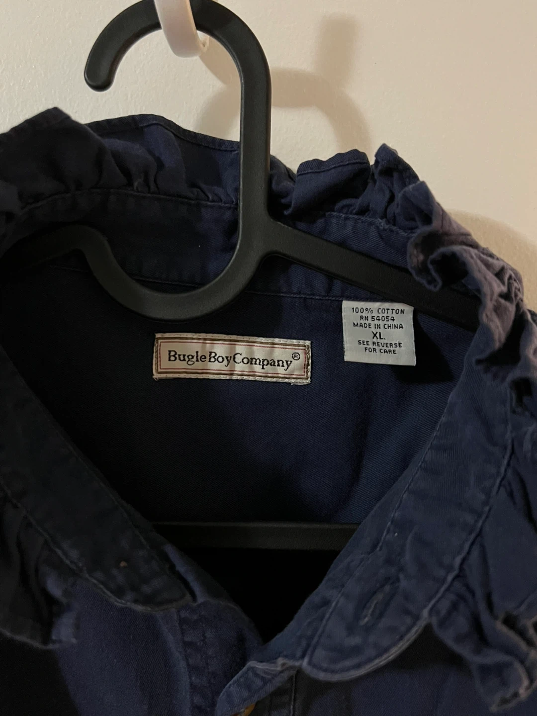 Here's a gently used Bugle Boy Company shirt in size XL. It's a navy blue colour and made of 100% cotton. Perfect for adding a touch of vintage style to your wardrobe!