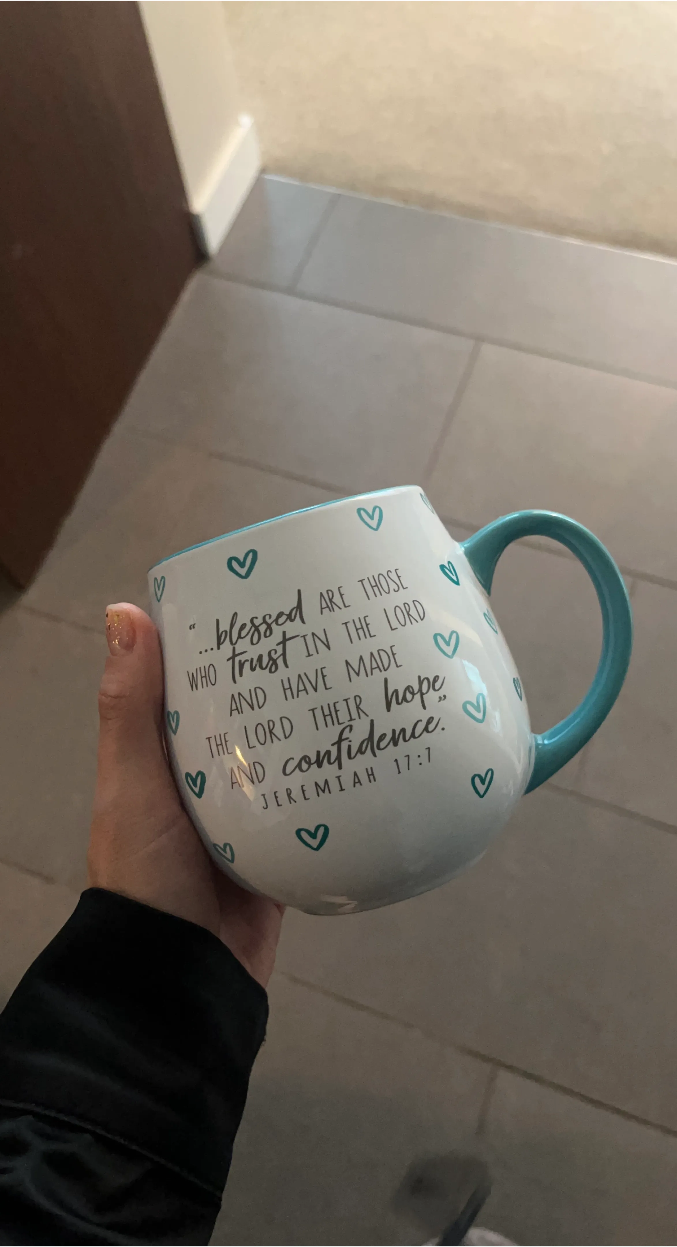 Here's a lovely mug with a quote from Jeremiah 17:7: "...blessed are those who trust in the Lord and have made the Lord their hope and confidence." It has cute little teal hearts all over and a matching teal handle