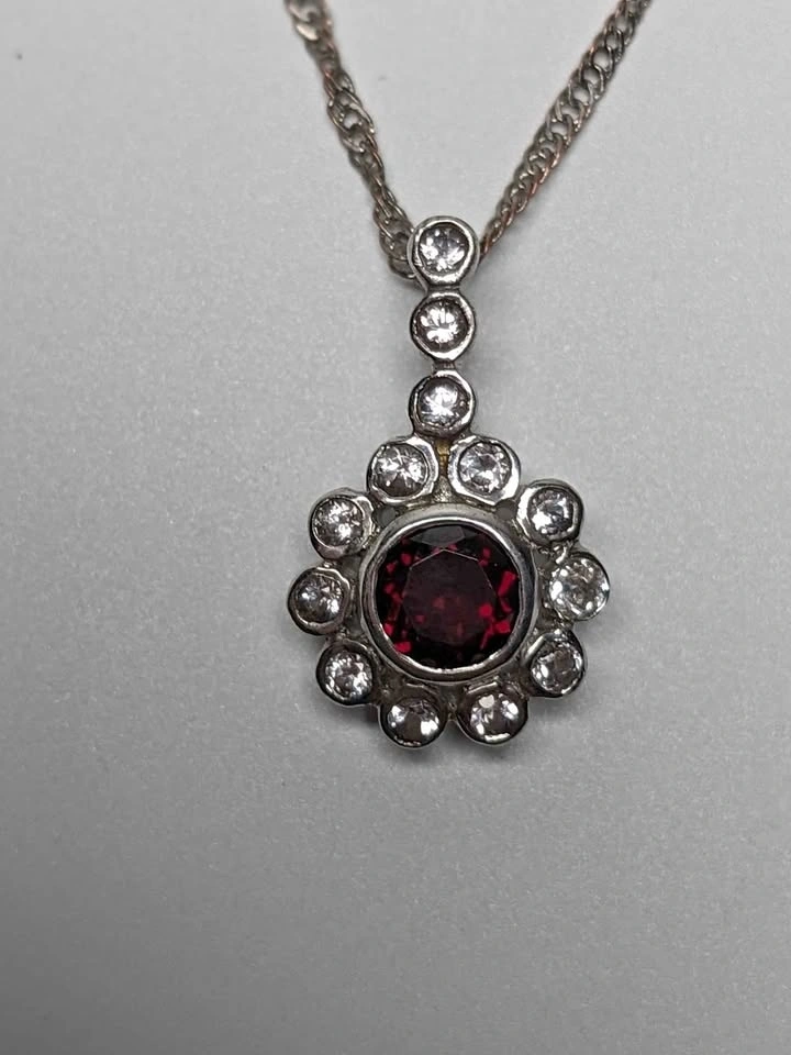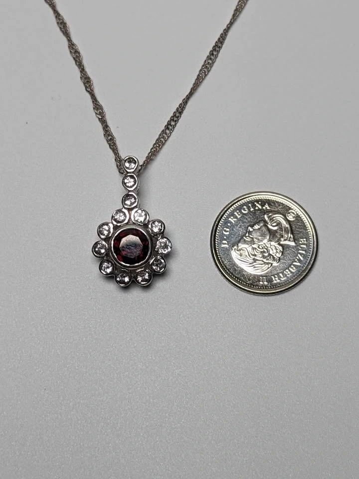 Elegant and eye-catching, this sterling silver pendant features a rich garnet centerpiece surrounded by sparkling white topaz accents (0.95ct total). The rhodium-plated finish enhances durability and shine, while the graceful arc of topaz stones adds a touch of modern sophistication. Pendant weight is approximately 2.75g and comes suspended on a classic 18" silver chain—ready to wear or gift. Ideal for January birthdays, romantic gestures, or gemstone collectors seeking timeless charm. Public pick up in Seba Beach Drayton Valley or Spruce Grove Alberta. I accept cash etransfer debit Visa or MasterCard