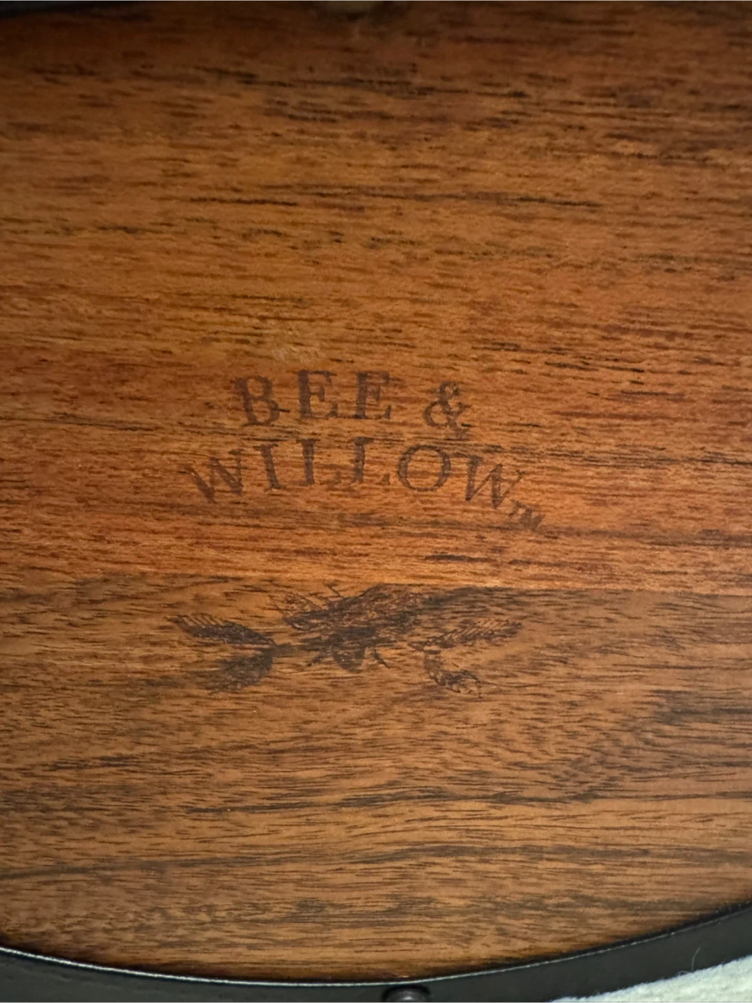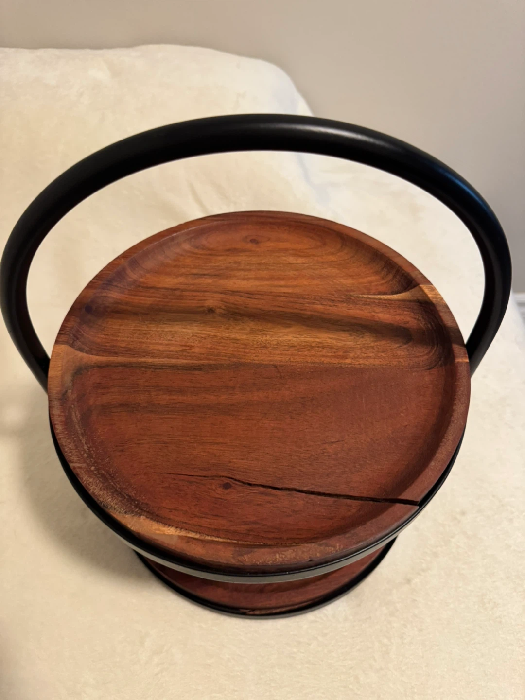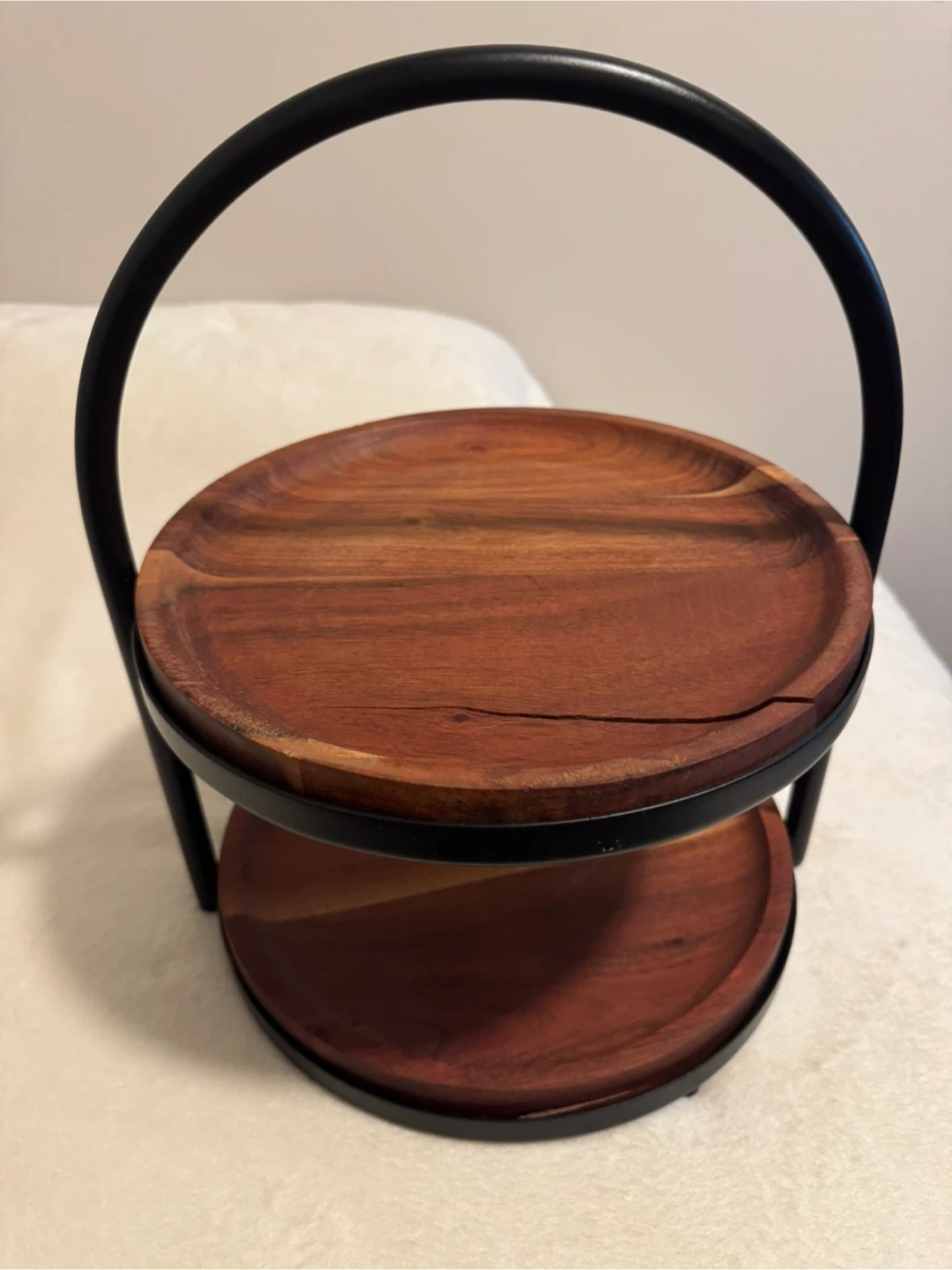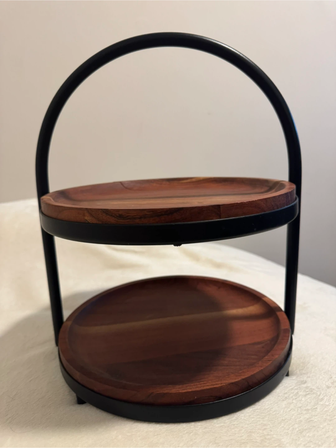 Selling a Bee & Willow two-tier serving stand! It's perfect for displaying treats or appetizers. The stand features a wooden surface and a black metal frame. It has cracked and for pick up only.