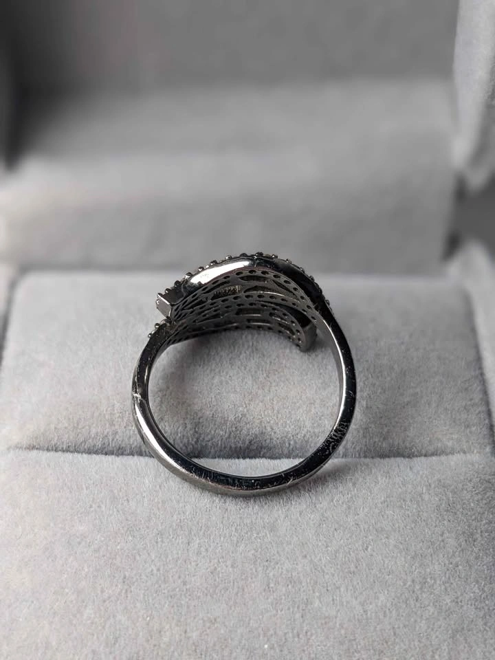 Elegant diamond ring set in black rhodium plated 925 sterling silver. Weighs 3.25 grams and features 0.4 carats of diamonds in a leaf-inspired design. Ring size is 7 and resizable. Ideal for collectors, gift buyers, or anyone seeking timeless sparkle. Tarnish-resistant and hypoallergenic.