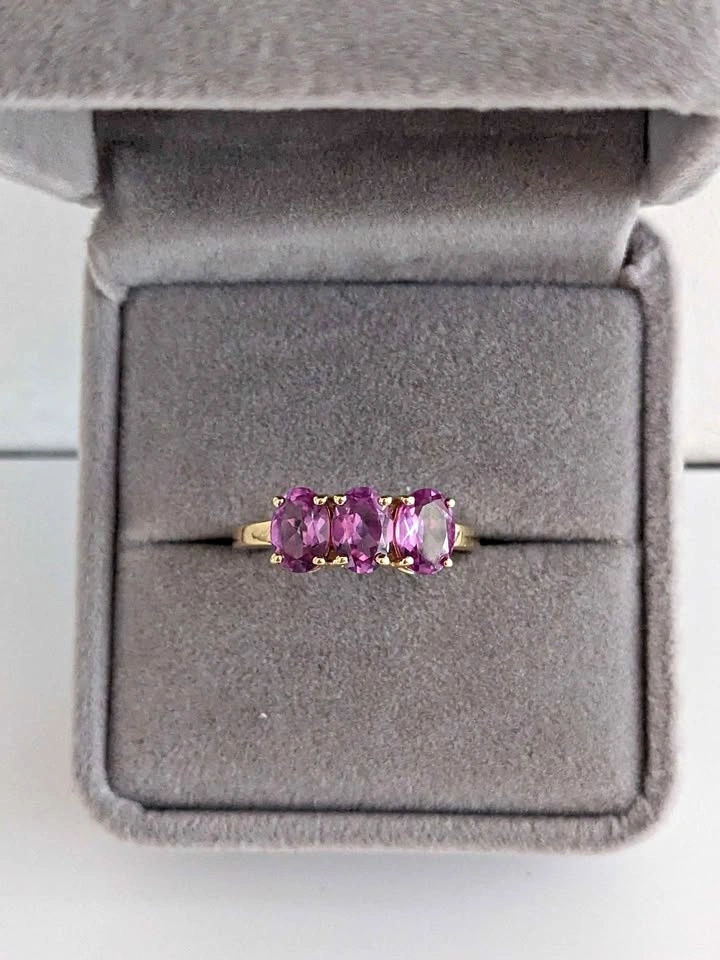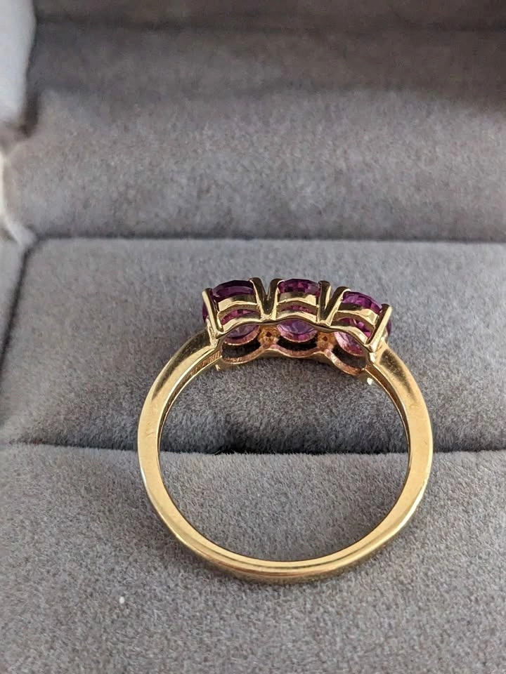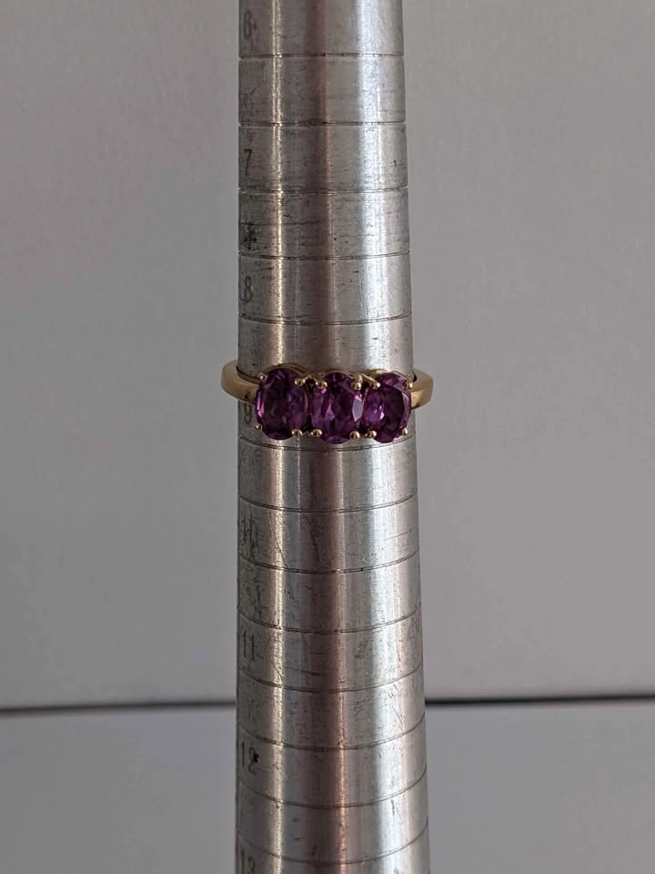 Add a touch of vintage inspired elegance with this gold-plated sterling silver ring featuring three oval-cut simulated alexandrite gemstones totaling 2.75 carats. The stones shift in hue under different lighting, mimicking the color-change allure of natural alexandrite.
