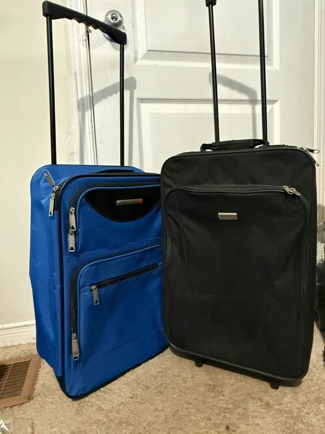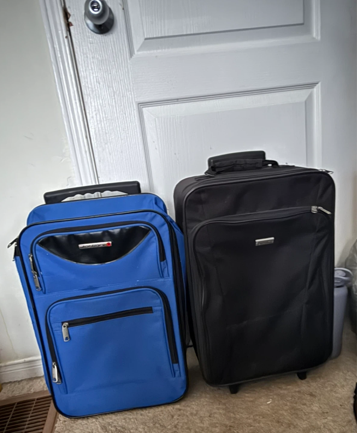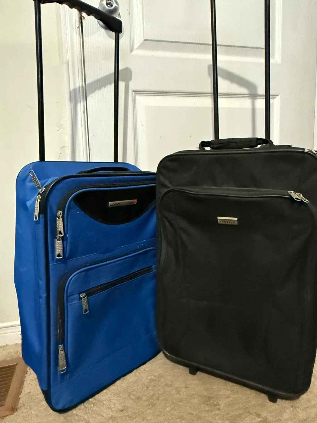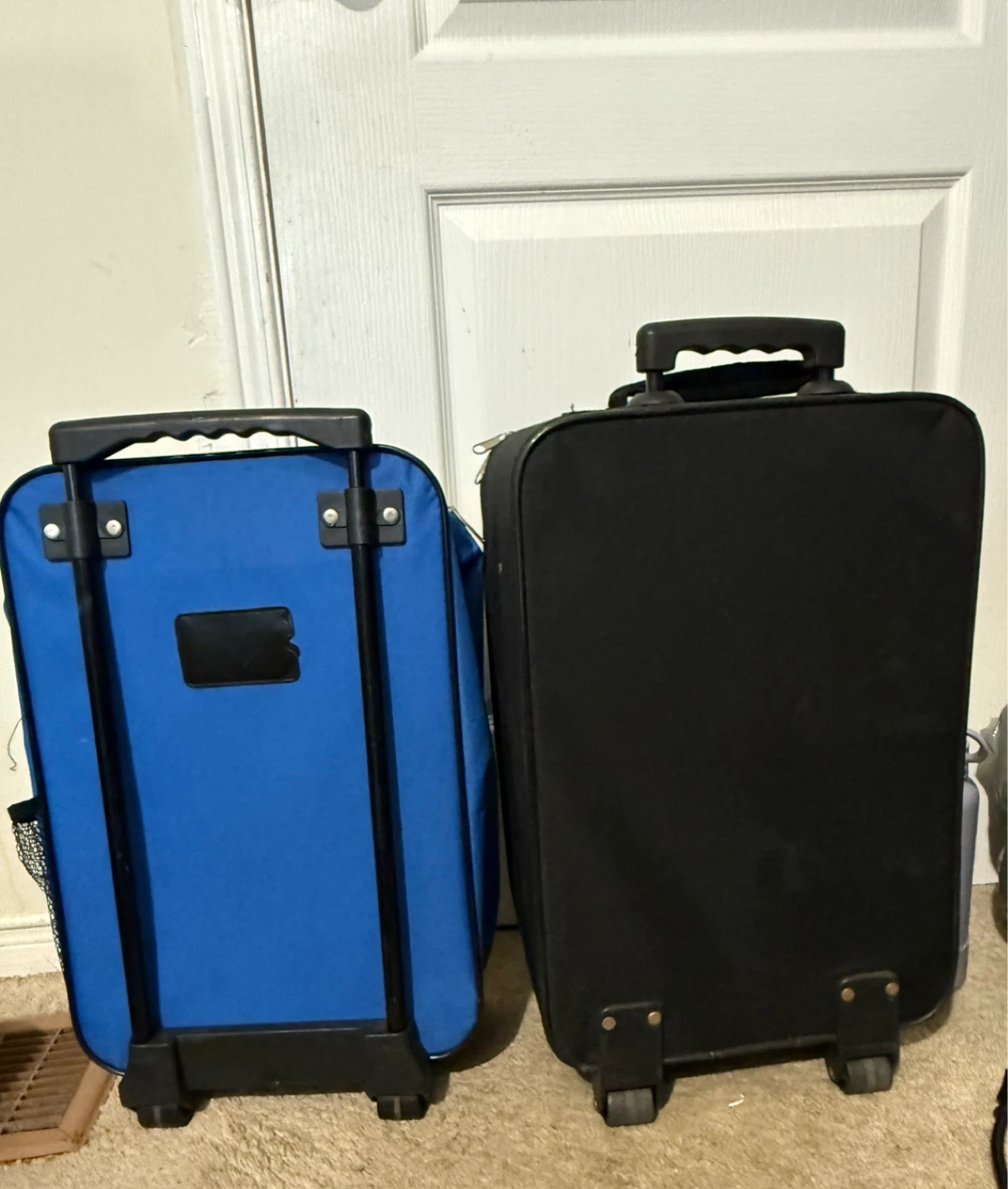 Matching Set of Two Rolling Suitcases (One Blue, One Black).