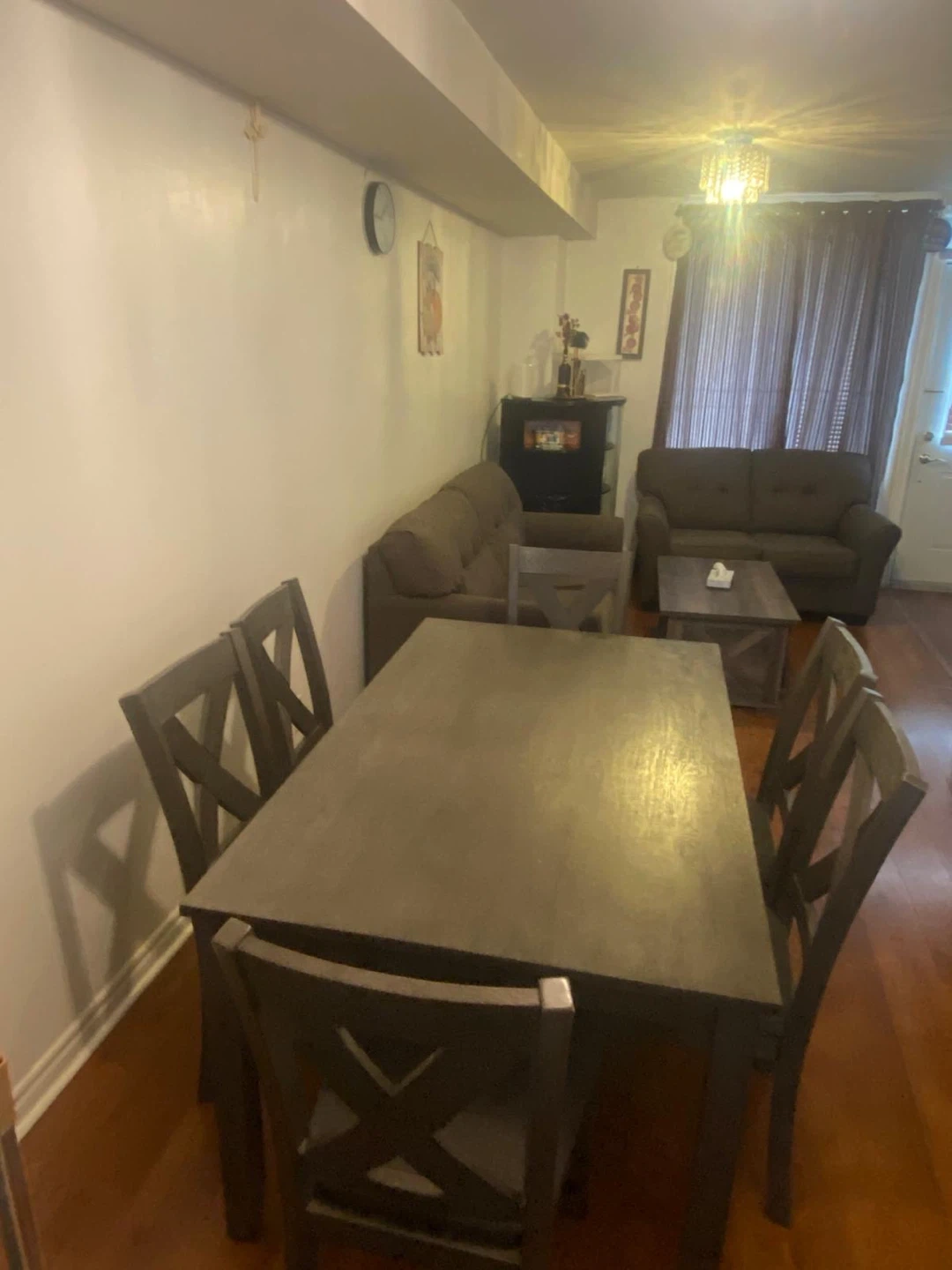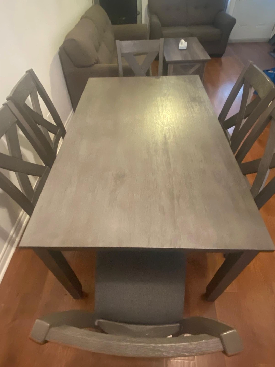 Selling a dining table with six chairs. The set is a grey colour and in good condition. Perfect for a small dining area or kitchen!