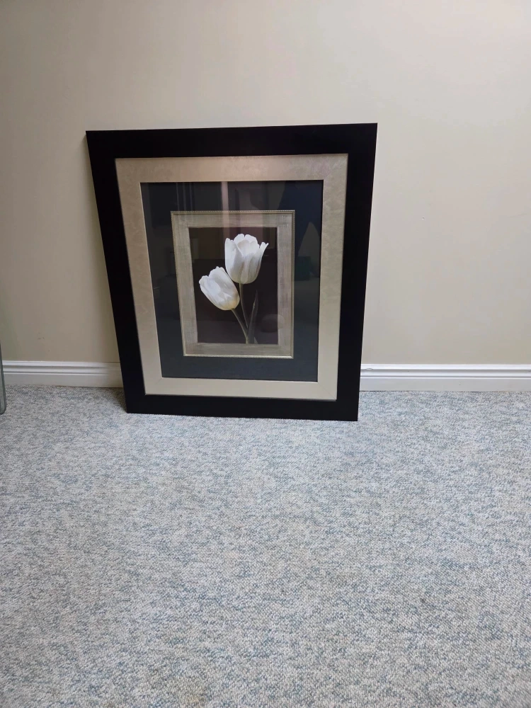 A lovely framed art print featuring white tulips. The frame is black with a silver inner border, adding a touch of elegance to any room