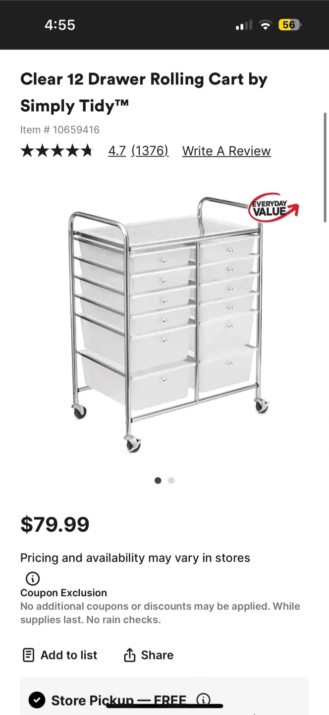 Selling a clear 12-drawer rolling cart by Simply Tidy. It's in used condition and originally retailed for $79.99. Selling for $45. Perfect for organizing your space!