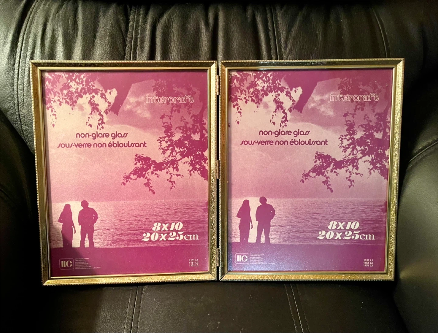 Selling a pair of articulated folding Intercraft picture frames. They are sized 8x10 inches (20x25cm). They feature non-glare glass and are unused but have very slight damage to the backing.