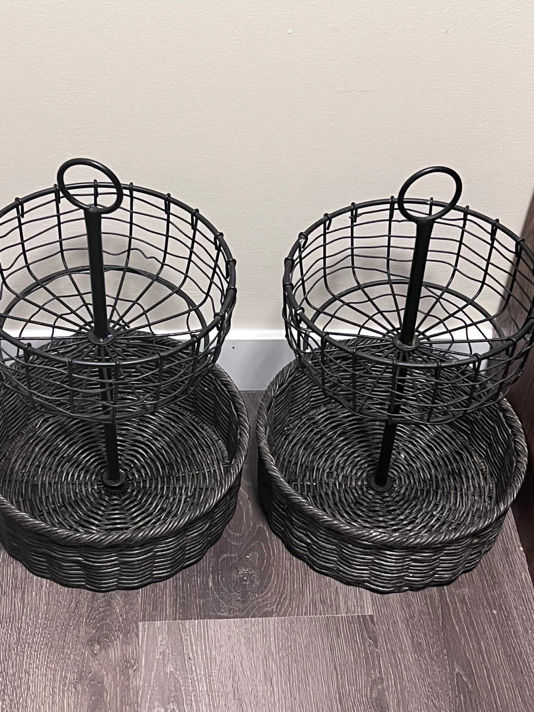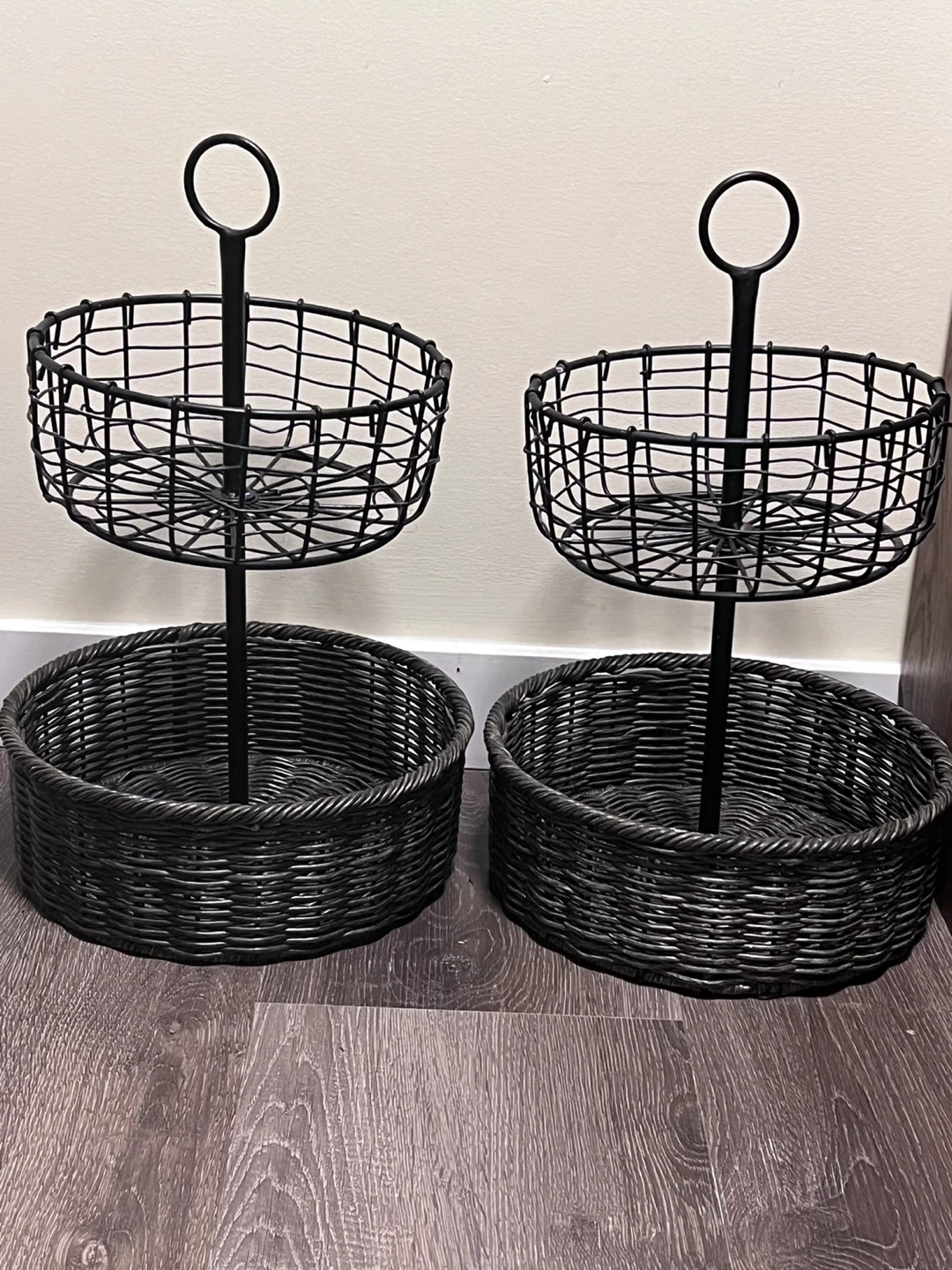 Selling two two-tiered baskets! These are great for organizing or displaying items. The top tier is a black metal wire basket, and the bottom tier is a black wicker basket. They're in good condition and ready for a new home!