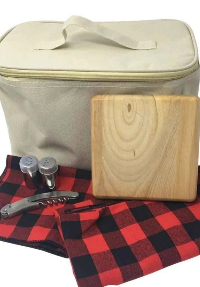 Sturdy Stella Artois picnic basket set with a solid middle handle. It is made from natural canvas fabric and features a split lid that snaps in place and 2 exterior pockets to accommodate small items. Contains: salt and pepper shakers, one red and black checked napkins, 1 red and black checked tablecloth, 1 metal bottle opener, 1 cheese and meat board, and one insulated lunch box with top handle and zip. Rubberized fabric bottom and reinforced corners to make this basket a durable one.