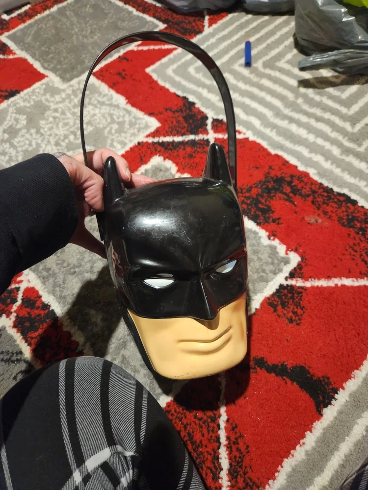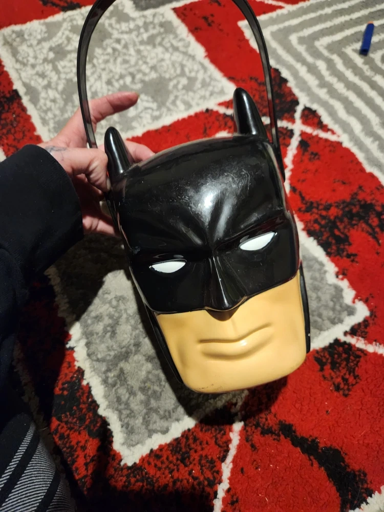 Selling a Batman plastic candy bucket! It's in great condition and perfect for Halloween or just for fun. It's black and tan and has a handle for easy carrying