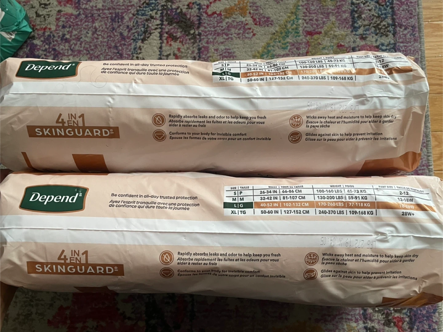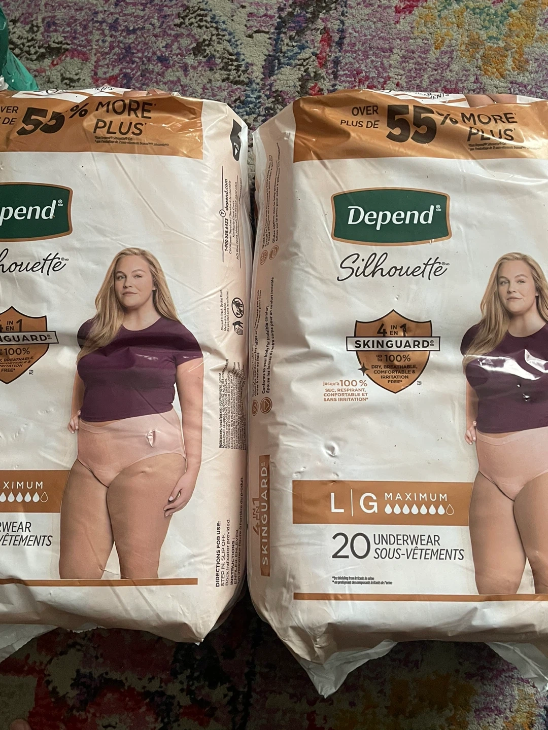 Selling two packs of Depend Silhouette underwear in size Large. Each pack contains 20 underwear. They are designed for maximum absorbency and have 4-in-1 Skinguard to help keep you dry and comfortable