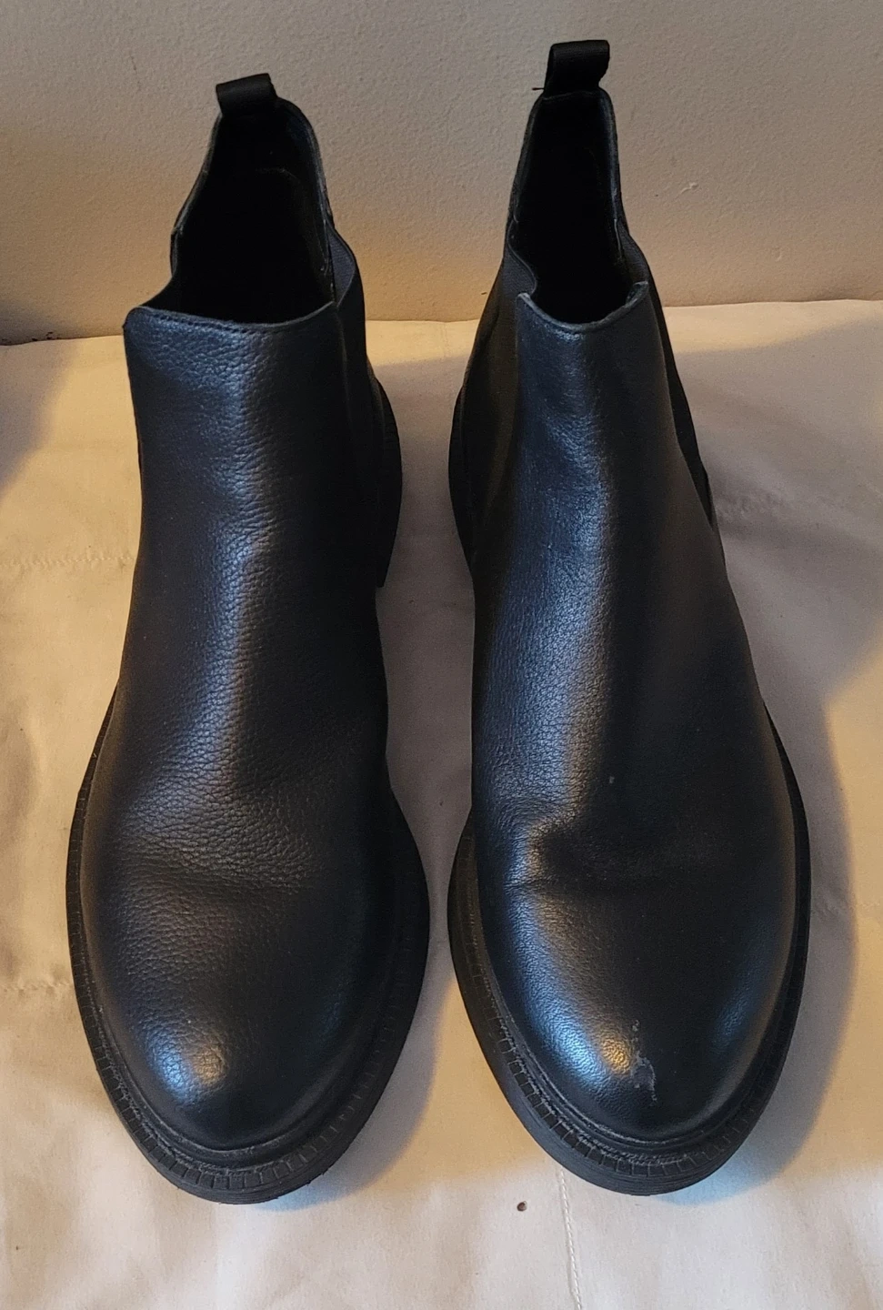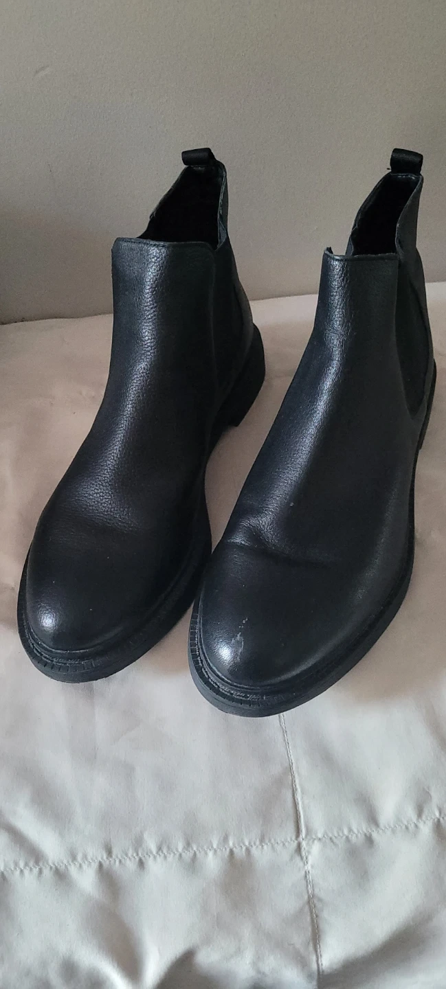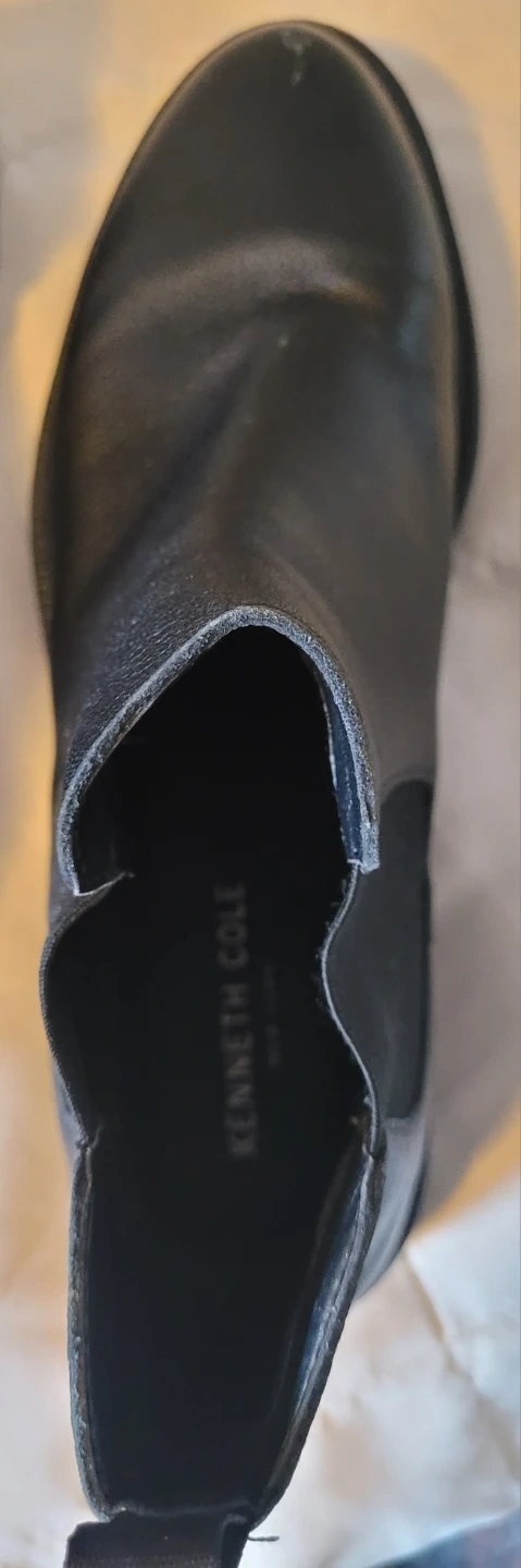 Selling a pair of Kenneth Cole Chelsea boots in black leather. They are a size women's 10M. They have never been worn, just tried on. No removable insole, small mark on top of left toe. Can be fixed with some black shoe polish or black marker, hardly noticeable. Too narrow for my wide feet. Perfect to wear with jeans, pants or dresses. Paid $69.99 @ winners.
