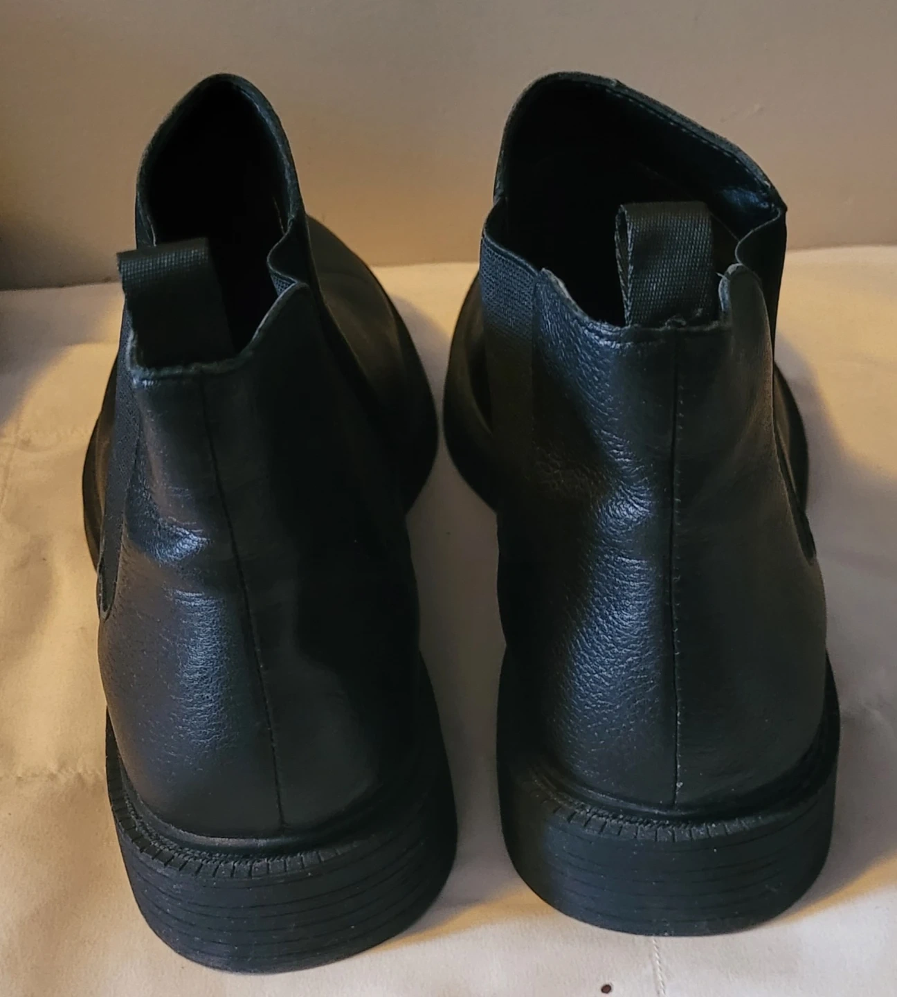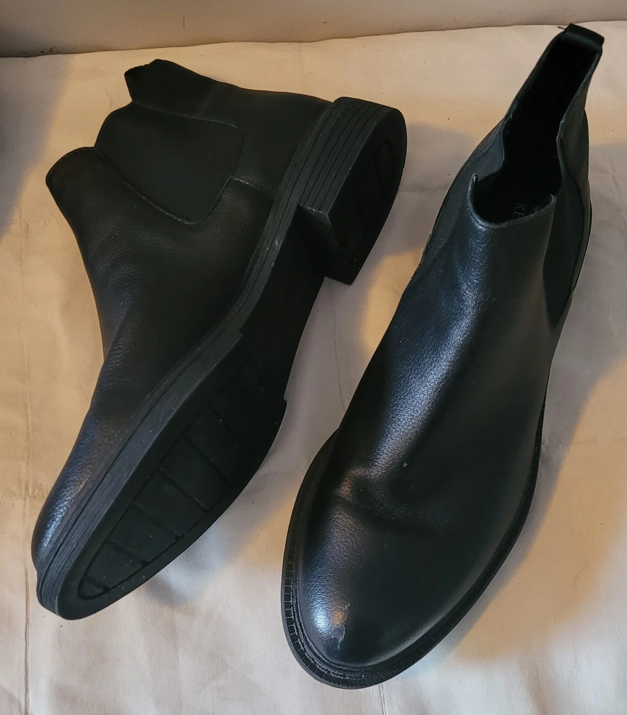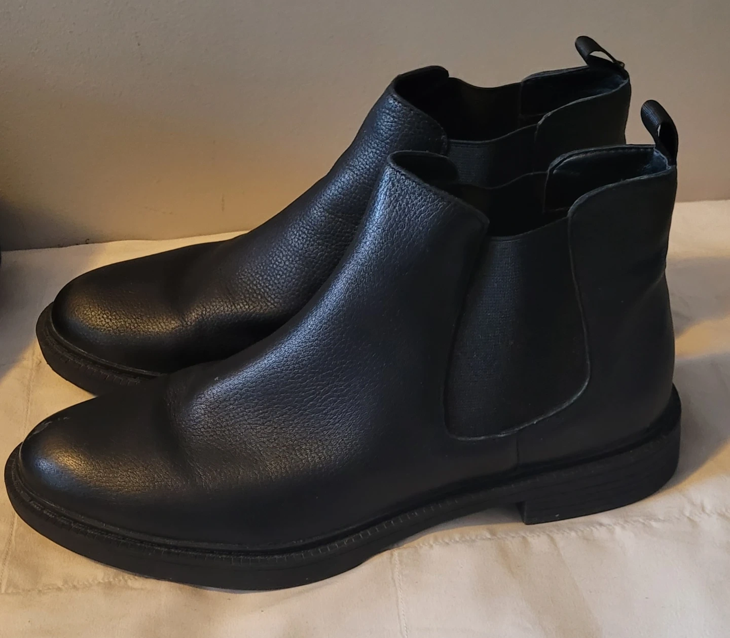 Selling a pair of Kenneth Cole Chelsea boots in black leather. They are a size women's 10M. They have never been worn, just tried on. No removable insole, small mark on top of left toe. Can be fixed with some black shoe polish or black marker, hardly noticeable. Too narrow for my wide feet. Perfect to wear with jeans, pants or dresses. Paid $69.99 @ winners.