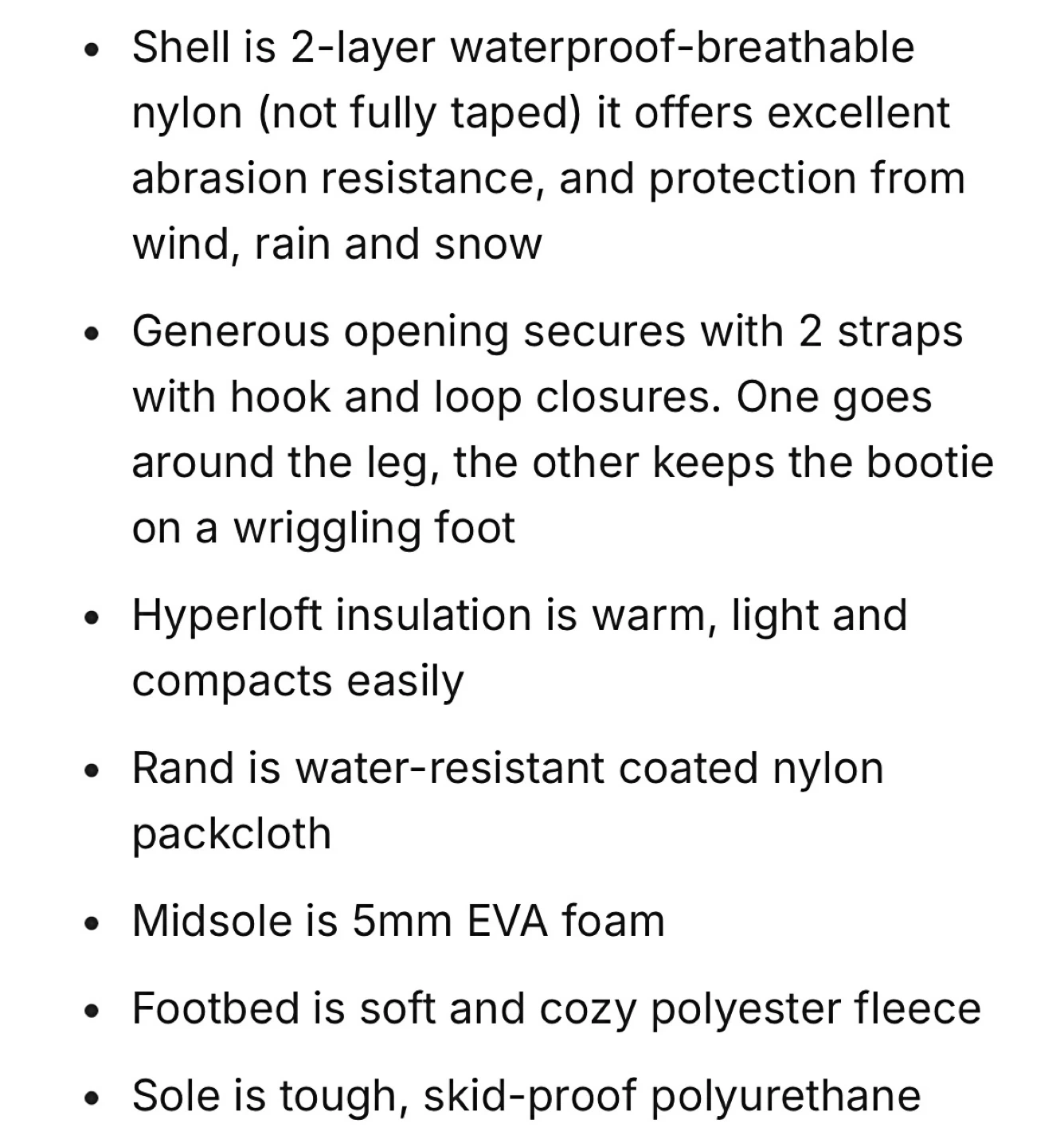 Waterproof-breathable shell, warm Hyperloft insulation, skid-proof soles, and secure Velcro straps. Great for stroller rides, daycare, sledding, or indoor warmth.
