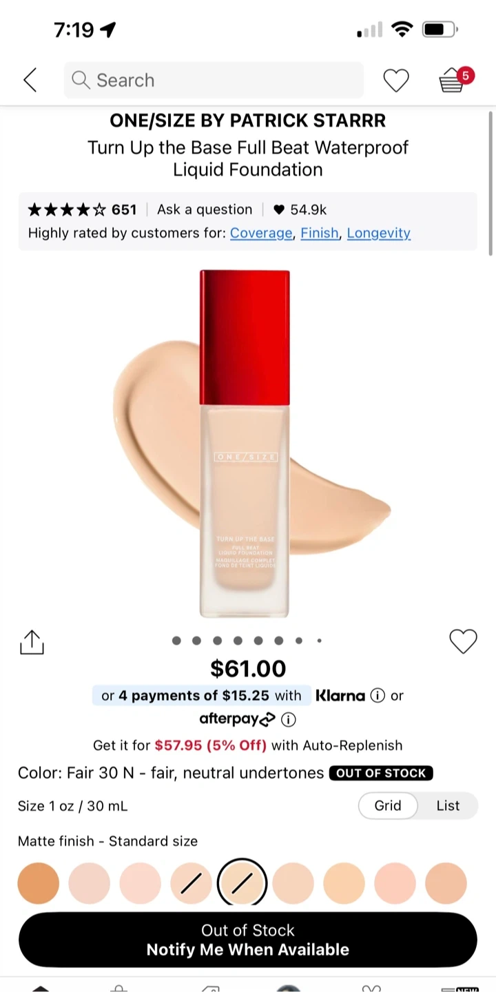 Selling ONE/SIZE by Patrick Starrr Turn Up the Base Full Beat Waterproof Liquid Foundation.