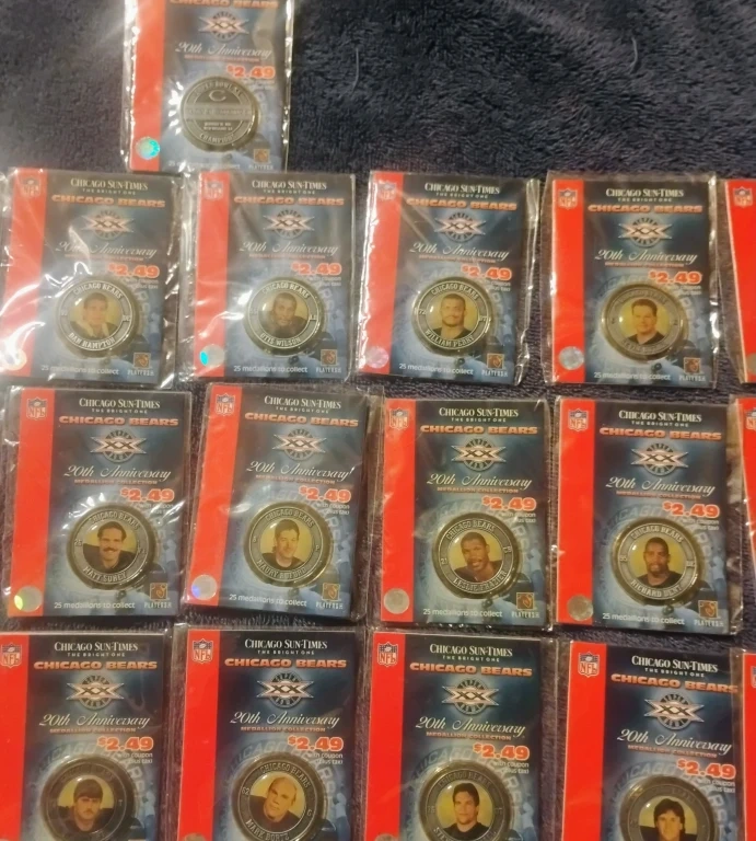 THE CHICAGO SUN-TIMES, CHICAGO BEARS 20th ANNIVERSARY MEDALLION COLLECTION OF THE 1985 CHICAGO BEARS TEAM WINNING SUPERBOWL XX (20) RELEASED IN 2005. THE COMPLETE 25 OF 25 SET ISSUED IN 2005. PLAYERS/HEAD COACH INCLUDE MARK BORTZ, WILBER MARSHALL, MIKE DITKA, OTIS WILSON, STEVE McMICHAEL, RICHARD DENT, DENNIS McKINNON, KEVIN BUTLER, RON RIVERA, JIM COVERT, LESLIE FRAZIER, KEITH VON HORNE, GARY FENCIK, JIM McMAHON, MAURY BUFORD, EMERY MOOREHEAD, WILLIAM PERRY, WILLIE GAULT, SUPER BOWL XX CHAMPIONS BEARS 46 PATRIOTS 10 JANUARY 25 1986 NEW ORLEANS LA, MATT SUHEY, TOM THAYER, DAN HAMPTON, WALTER PAYTON, DAVE DUERSON, MIKE SINGLETARY. WITH THE NFL HALOGRAPHIC/HALOGRAM SEAL FOR AUTHENTICITY. THE COINS ARE NEW, NEVER OPENED, STILL SEALED IN IT'S ORIGINAL PACKAGING.