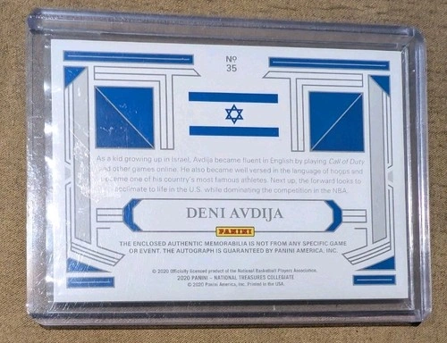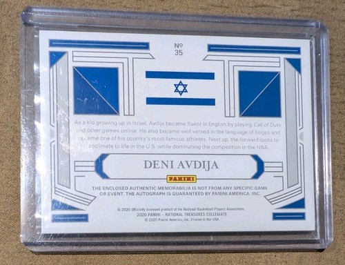 Capture a piece of basketball history with this 2020-21 Panini National Treasures Collegiate Deni Avdija Rookie Patch Auto card. This exclusive collectible features a crisp autograph and a piece of game-worn material, reflecting Avdija's seasons with Maccabi Tel Aviv before joining the NBA, first with the Washington Wizards and then with the Portland Trail Blazers. Its limited edition nature, card-numbered to just 7 of 35, makes it a coveted item for collectors and fans alike.