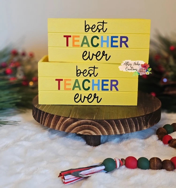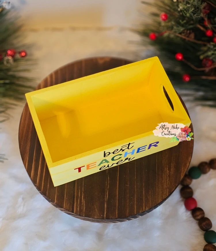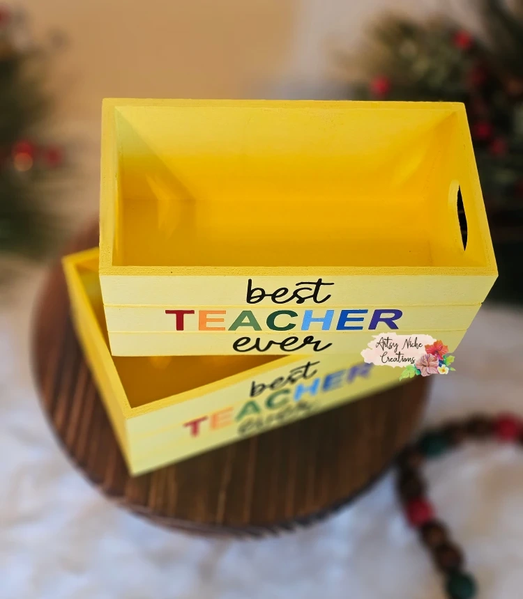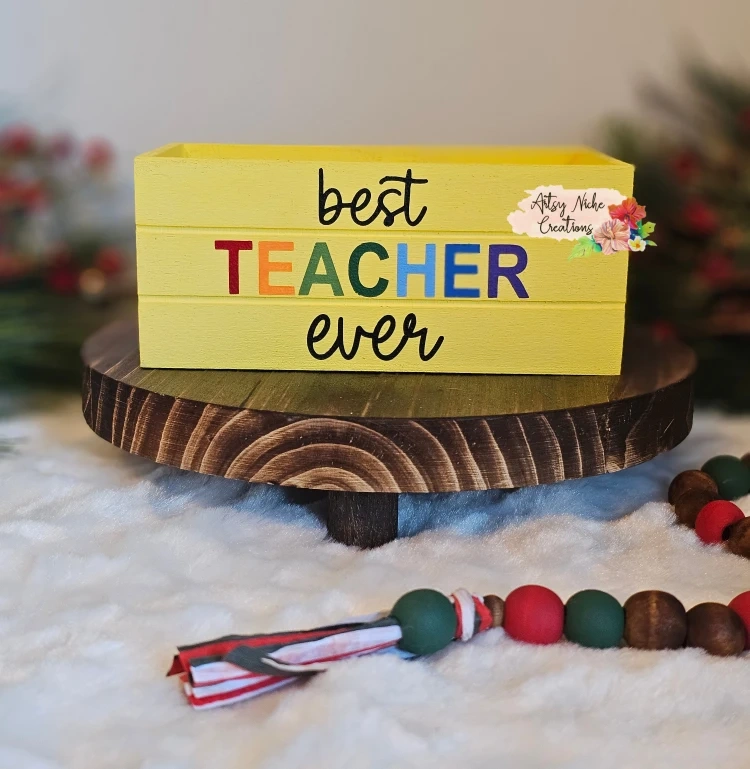 This is a cute Artsy Niche Creations mini wooden box that would make a great gift for a teacher. It's yellow with "best TEACHER ever" printed on the side in colorful letters. It's in new and ready for pick-up.