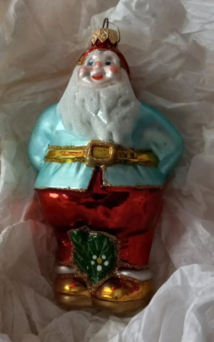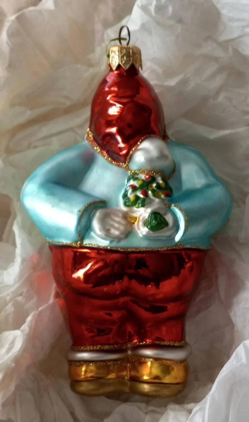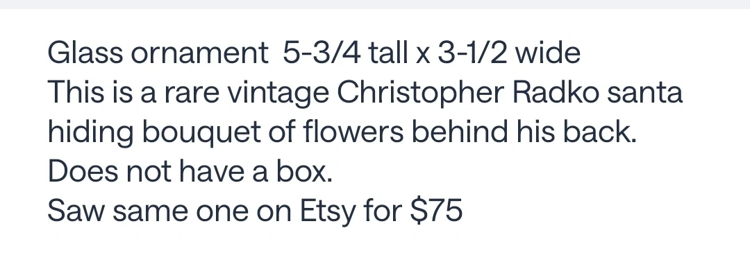 Selling a rare vintage Christopher Radko Santa ornament! It's a glass ornament that's 5-3/4 tall x 3-1/2 wide. This Santa is hiding a bouquet of flowers behind his back.