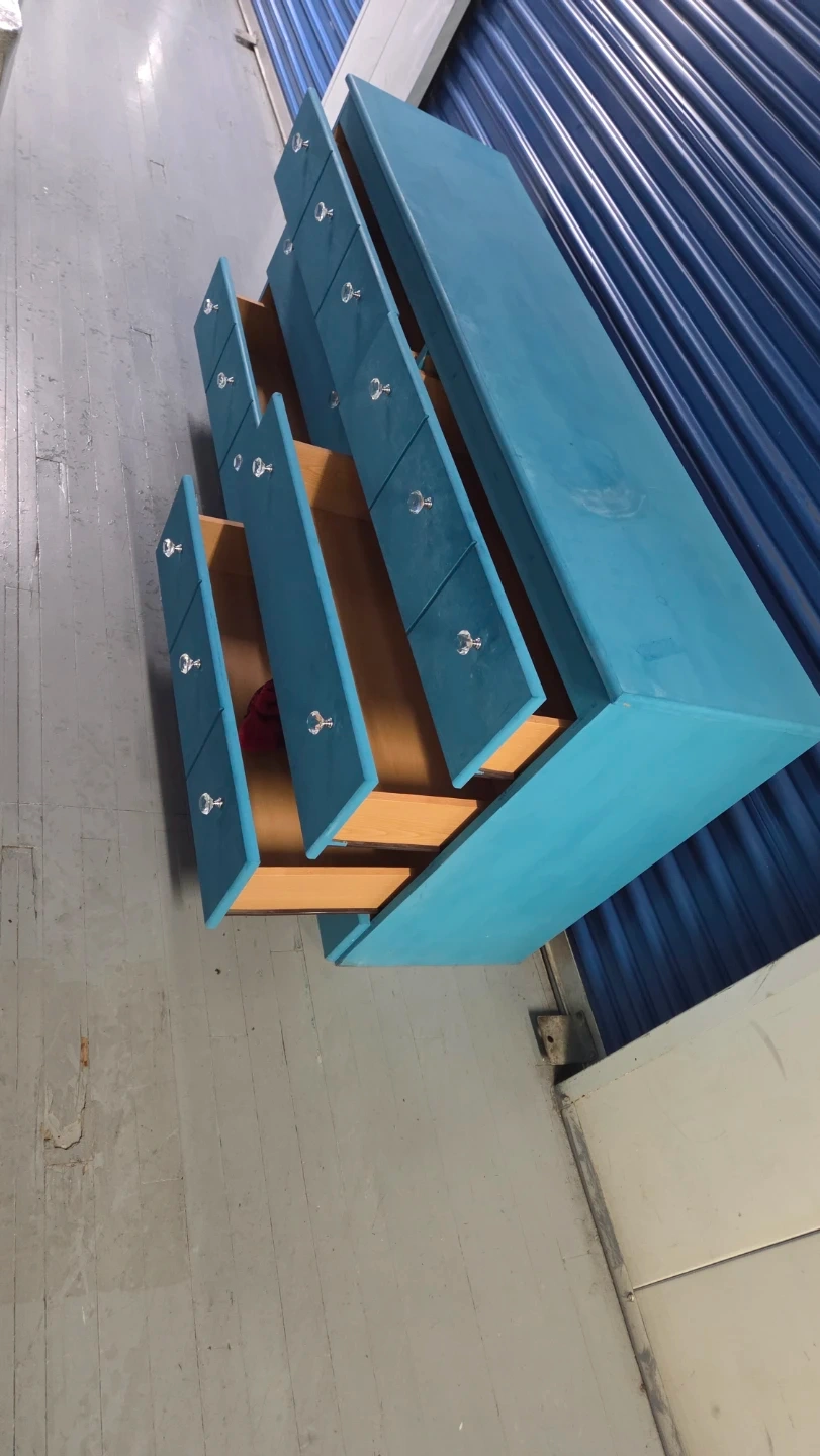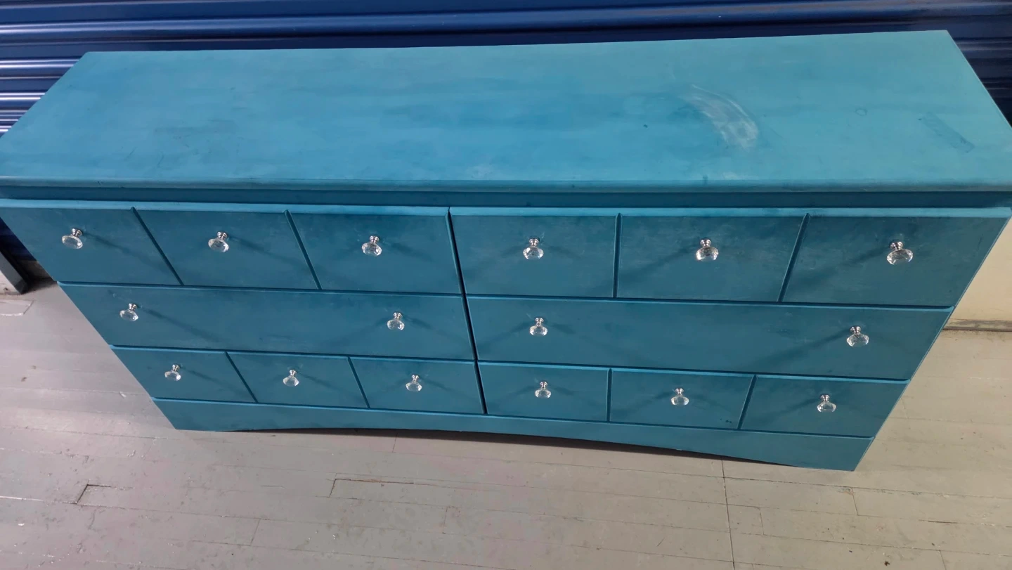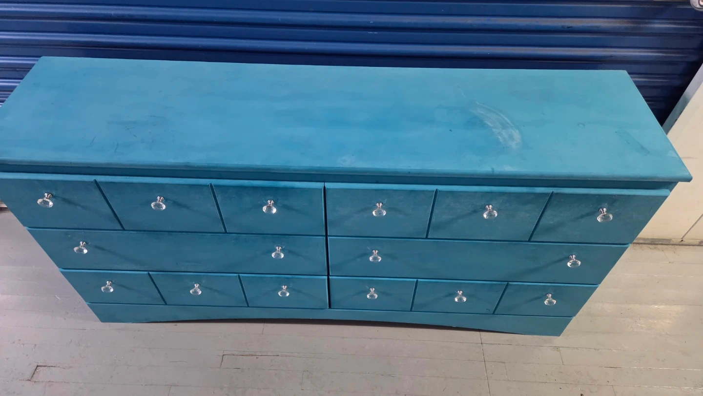 Here's a beautiful turquoise dresser that's sure to add a pop of color to any room! It features elegant crystal knobs on each of the drawers. This dresser is perfect for storing clothes or other items, and it will look great in a bedroom, living room, or any other space in your home