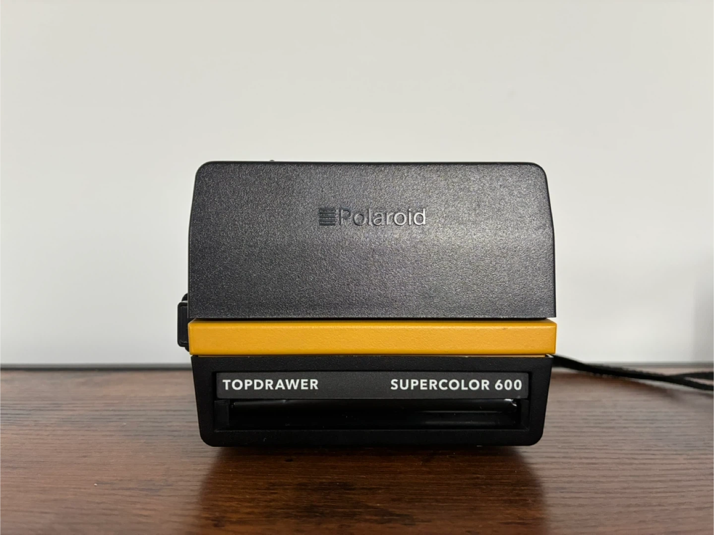 Selling a Polaroid Supercolor 600 Topdrawer instant camera! It's in great condition and ready to capture some fun memories. The camera has a classic design with a black and yellow color scheme. Perfect for anyone who loves vintage cameras and instant photography