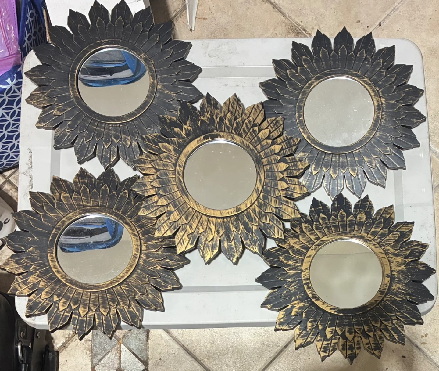 Selling a new set of 5 sunburst mirrors! They're perfect for adding a unique touch to your home decor. The mirrors have a beautiful black and gold finish that will complement any room. They are in great condition and ready to brighten up your space.