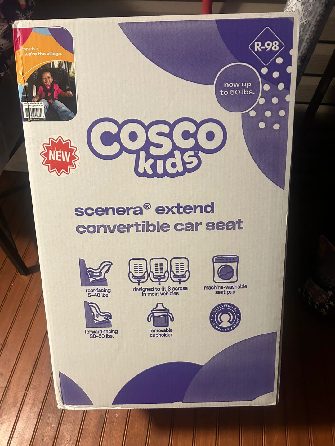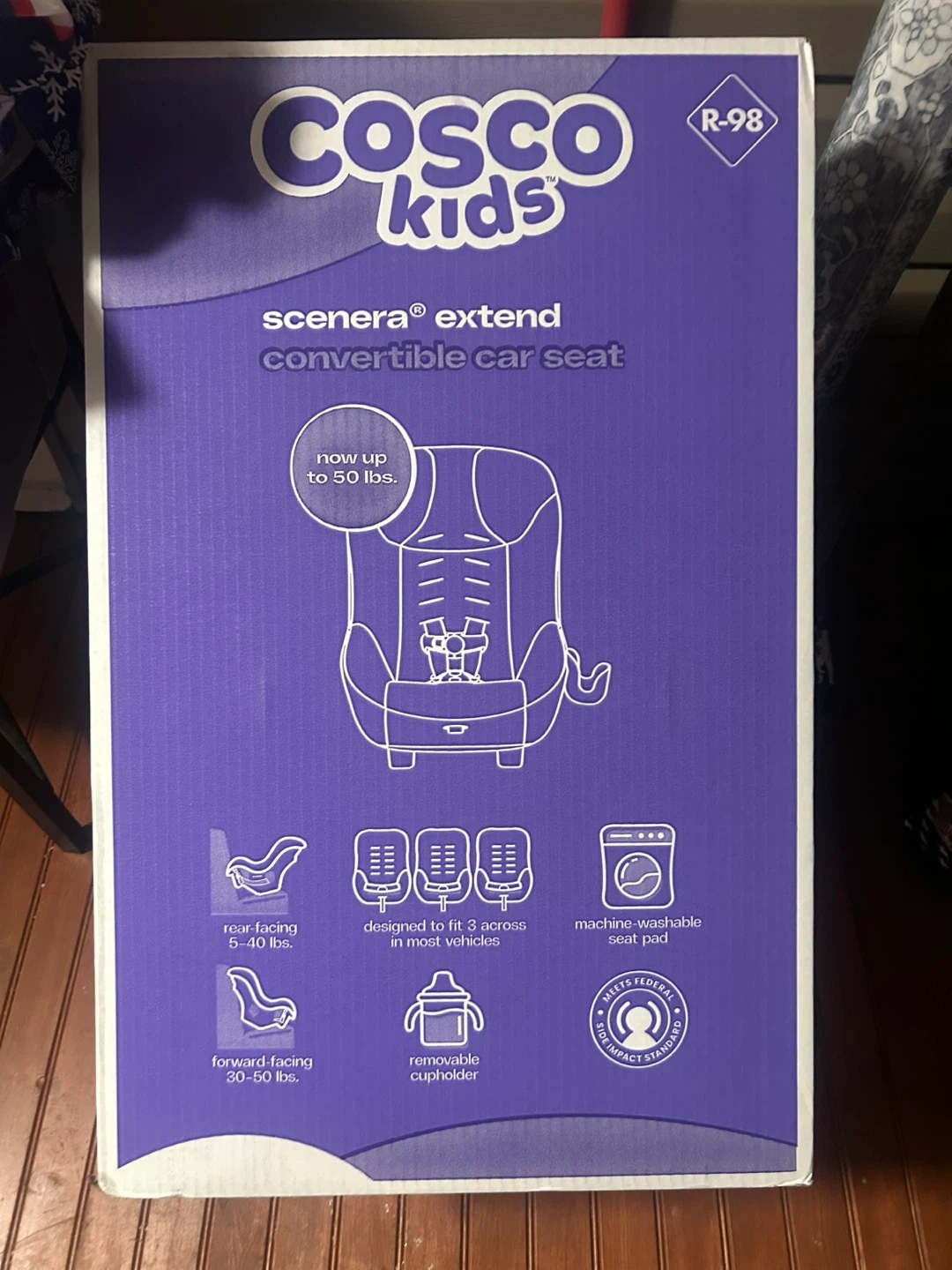 Selling a brand new Cosco Kids Scenera Extend convertible car seat! It's designed to fit 3 across in most vehicles and can accommodate children up to 50 lbs. The seat pad is machine-washable, and it includes a removable cup holder. It can be used rear-facing for children 5-40 lbs and forward-facing for children 30-50 lbs