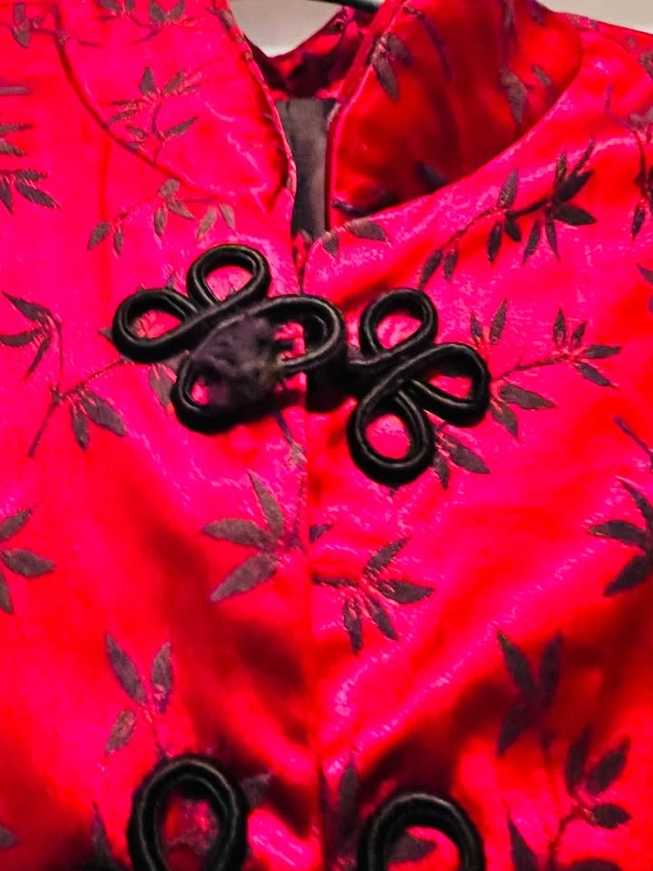 Make an entrance with this vibrant red satin brocade jacket, beautifully designed with black floral embroidery and traditional-style decorative knot closures. Wear as an open layer or on its own!