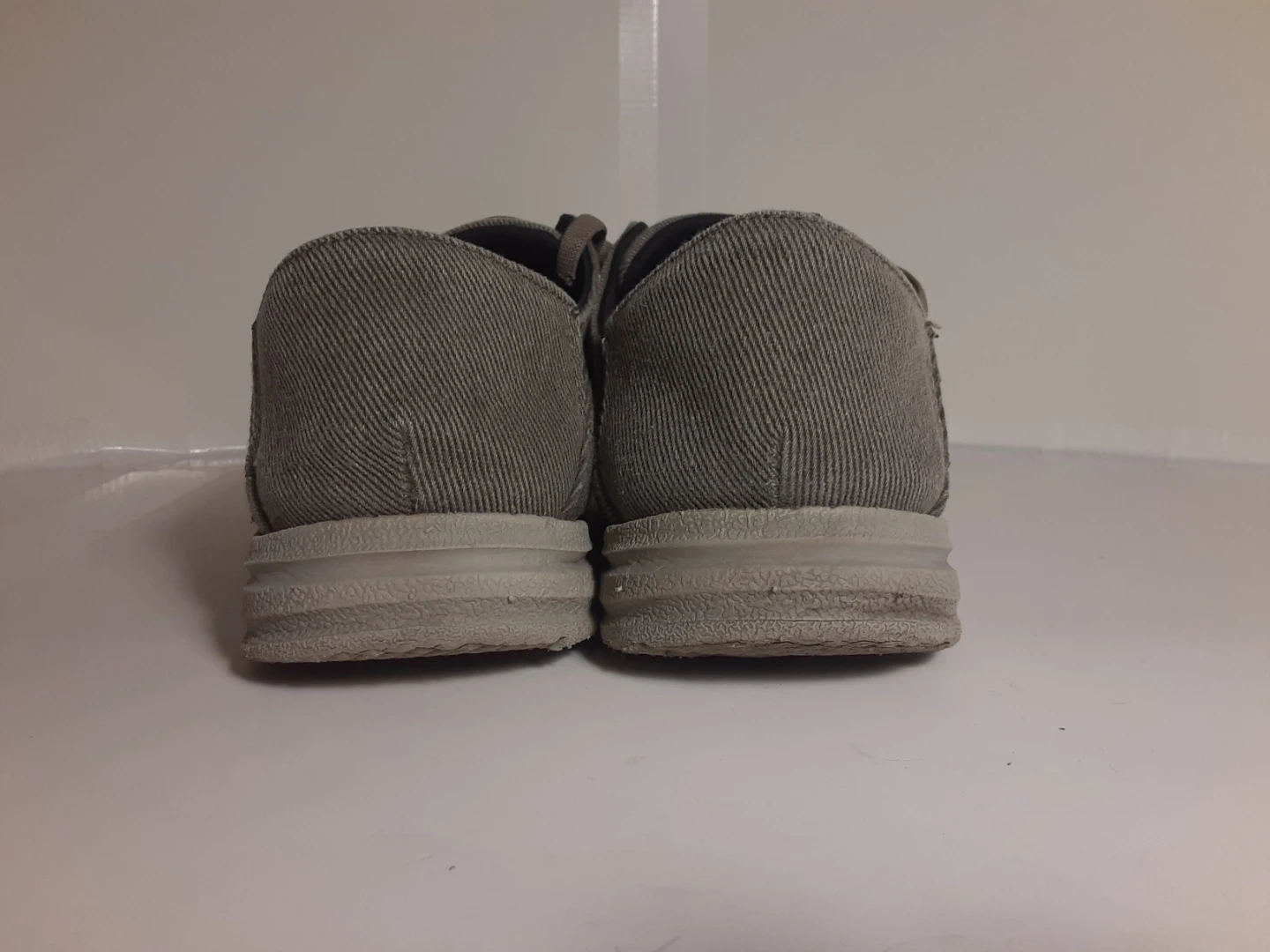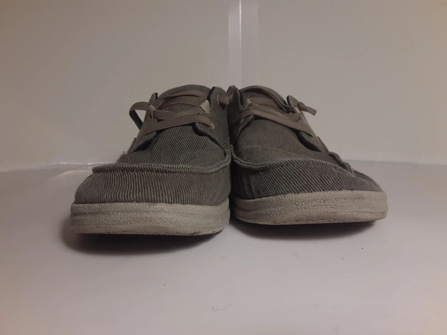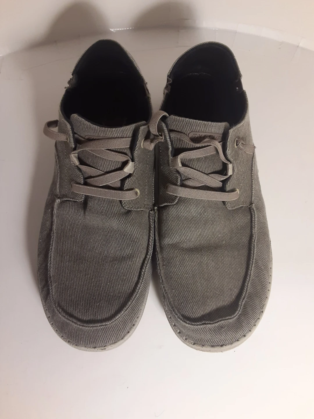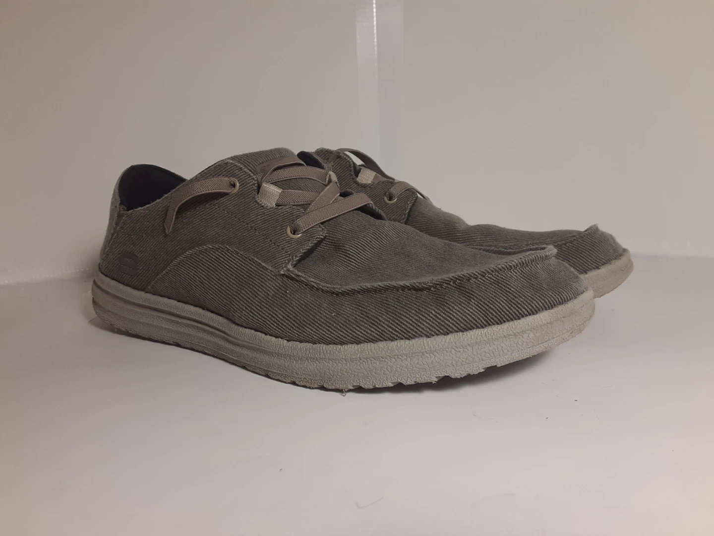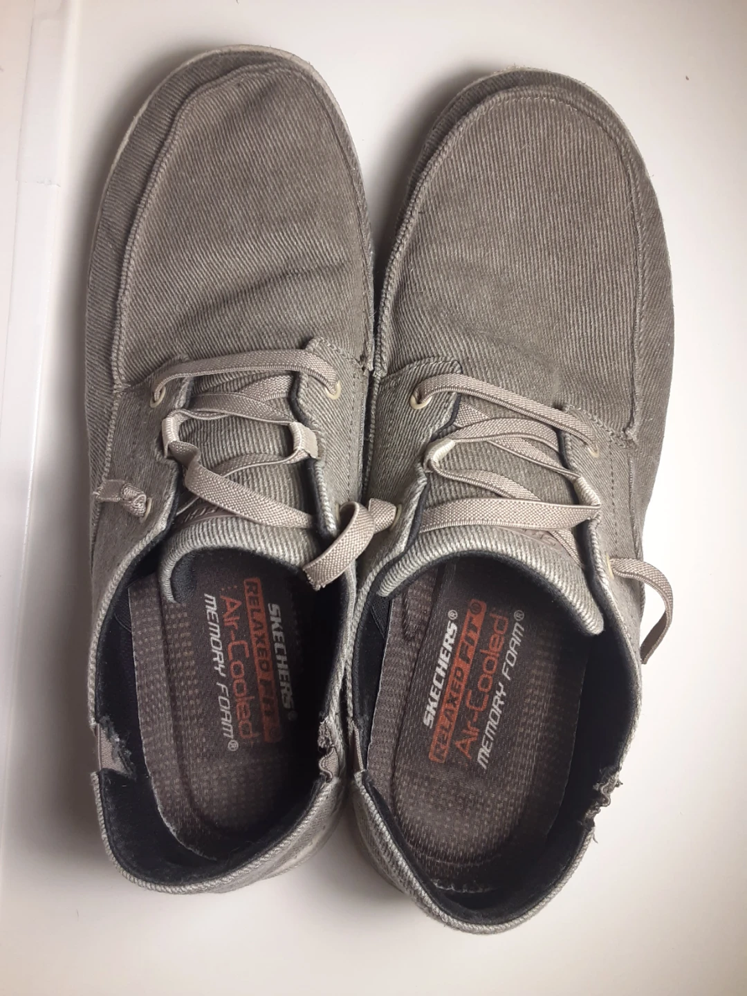 Skechers Relaxed Fit men's shoes, size 12. Showing signs of use, the main damage is on the inside of the shoe near the front(both soles have been slightly worn down, the photo is the worst of the two). The other damage(very minor, see images) is just the outer bottom of both soles. They are in excellent condition otherwise and are definitely a relaxed fit.