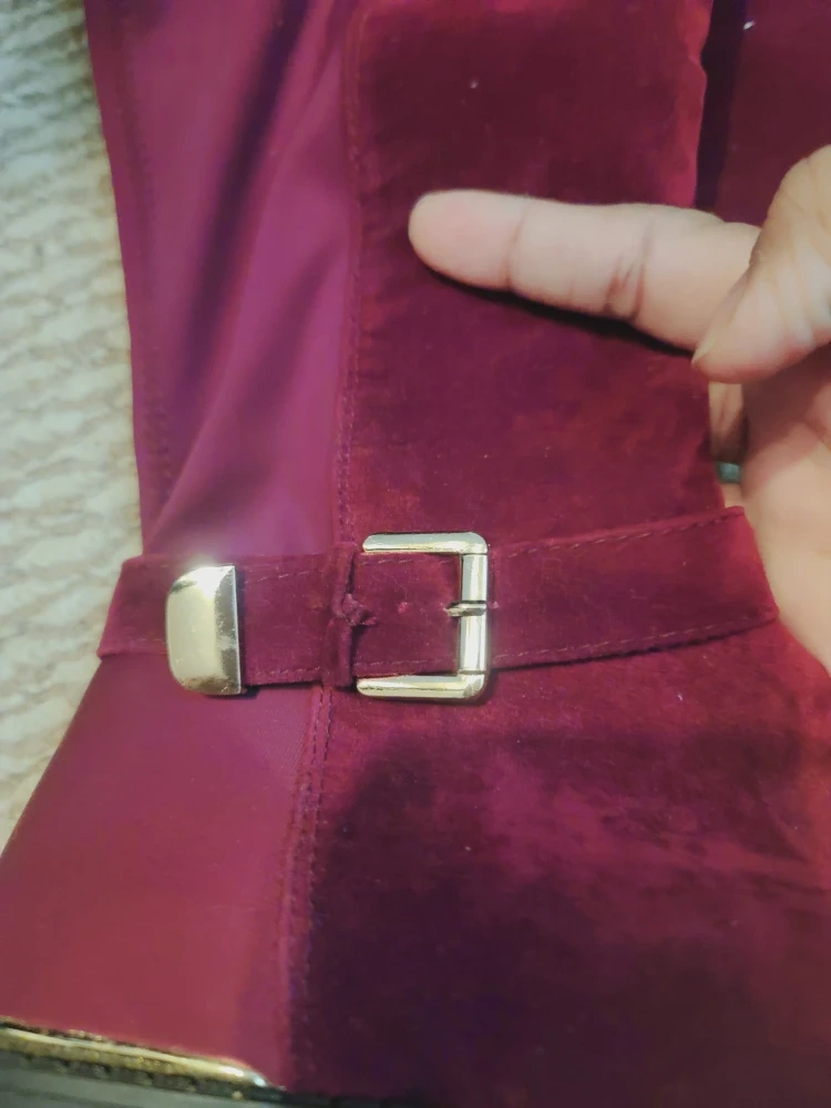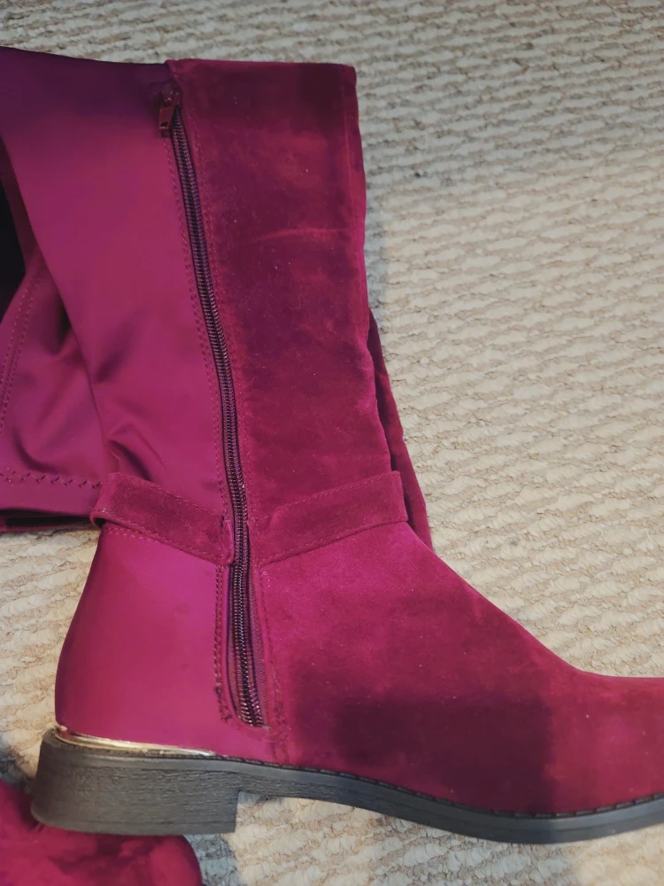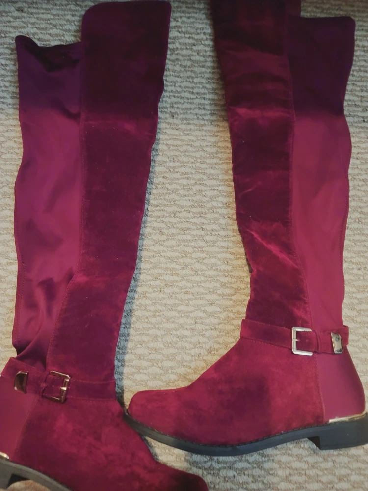 Selling a pair of burgundy, over-the-knee boots. They feature a stylish buckle detail and a convenient zipper closure. Perfect for adding a pop of colour to your wardrobe!