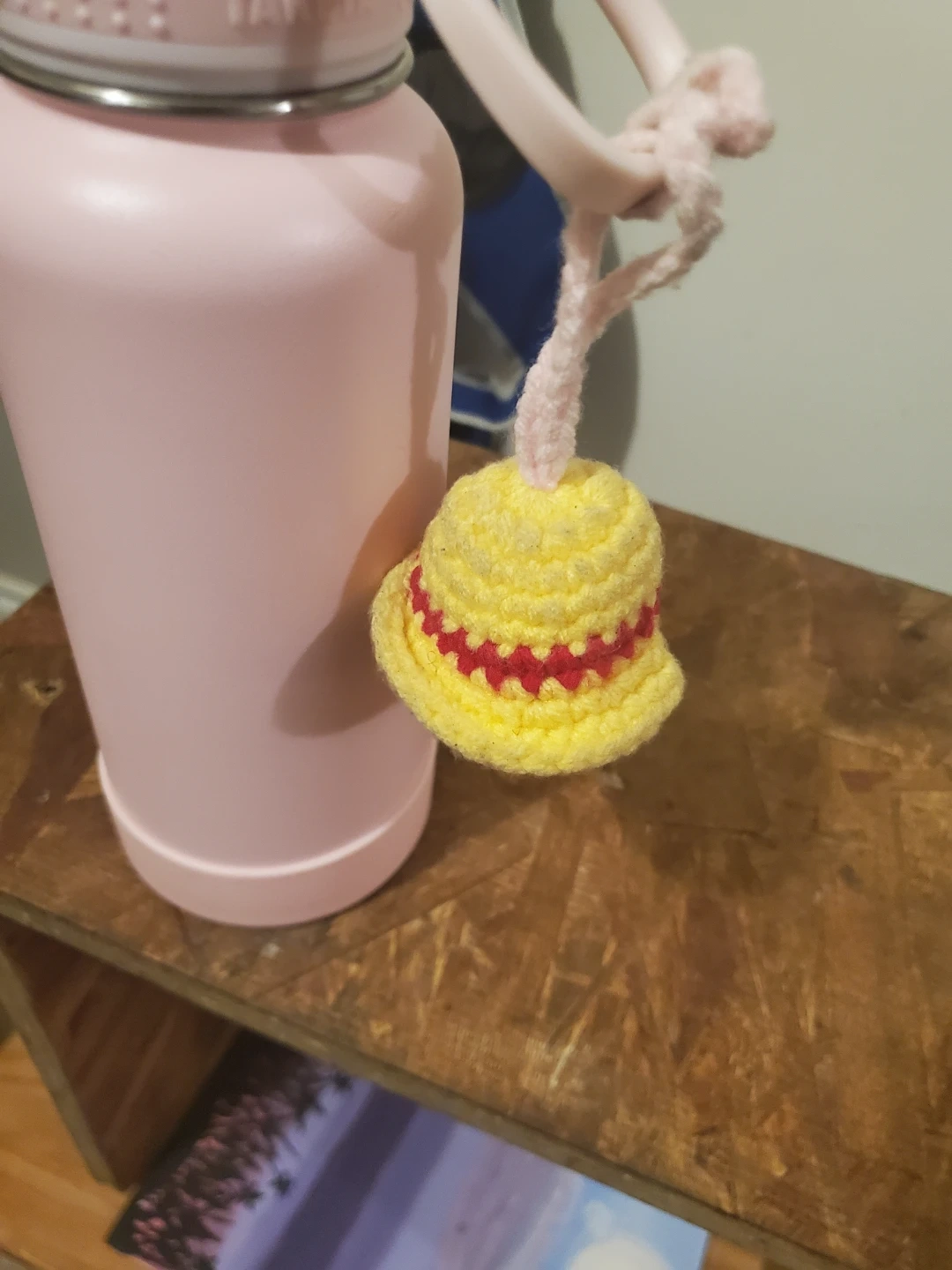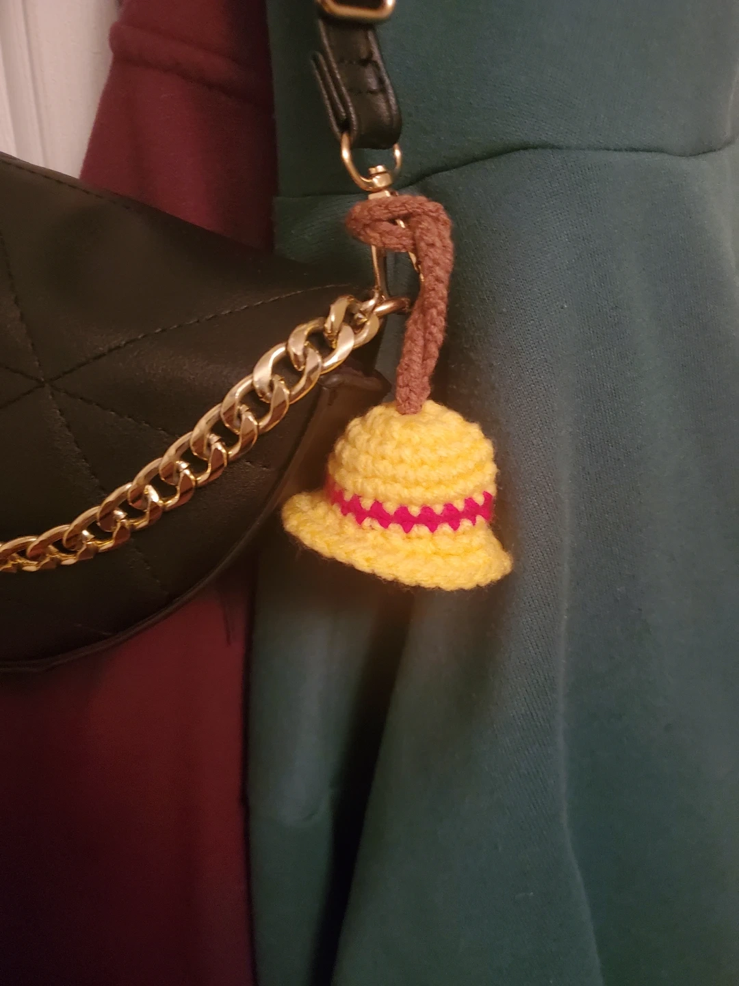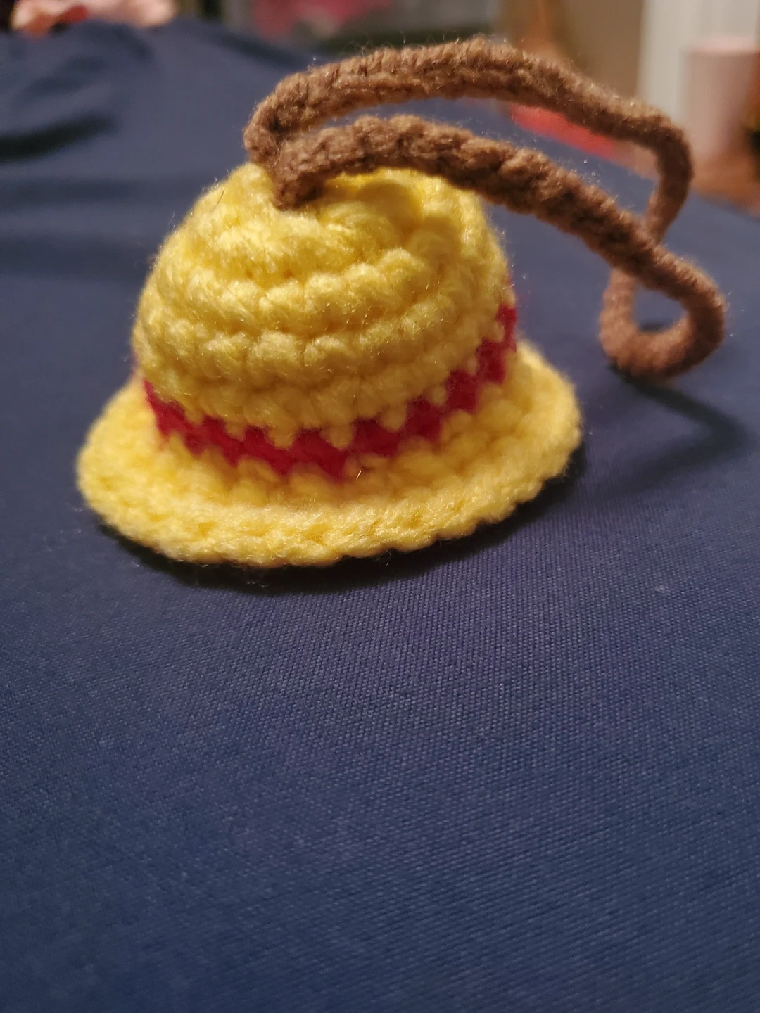 $2 per keychain Selling a crochet keychain based on Luffy's Straw hat (a character from One Piece). It would be perfect for adding some charm to your bag or keys. Only 10 in stock (this item is unisex)