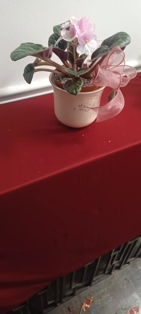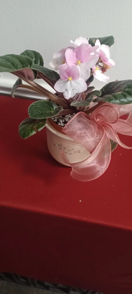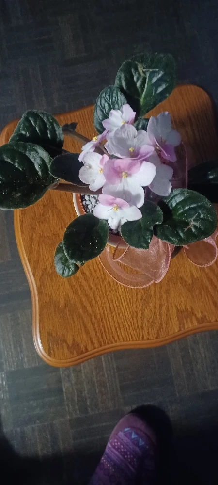 A lovely African Violet plant in a decorative pot. It's got beautiful pink and white flowers and healthy green leaves. Perfect for adding a touch of colour to your home!