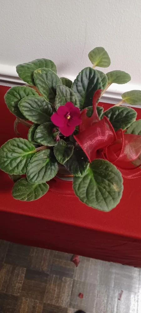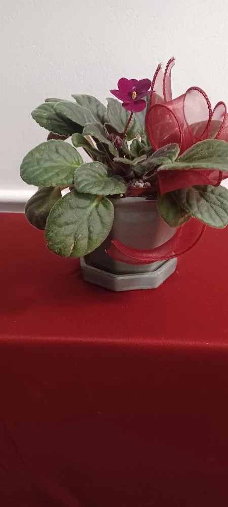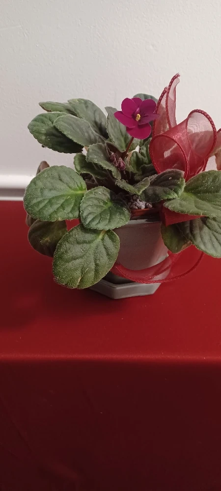 Here's a lovely African Violet plant, perfect for adding a touch of colour to your home. It comes in a nice pot and has a decorative red ribbon.