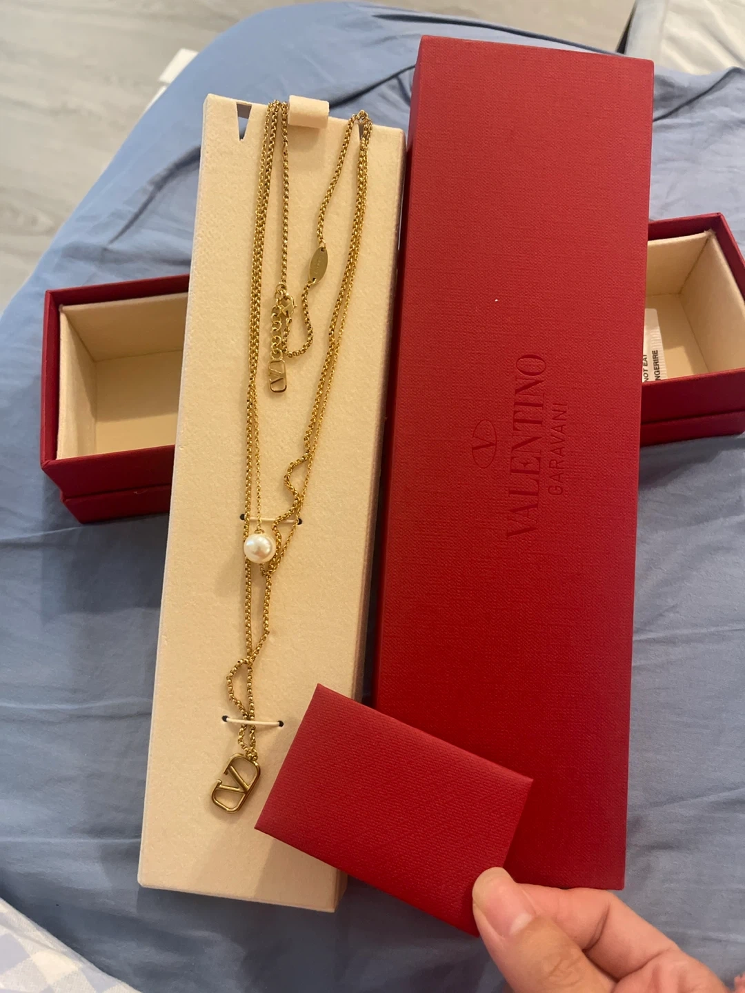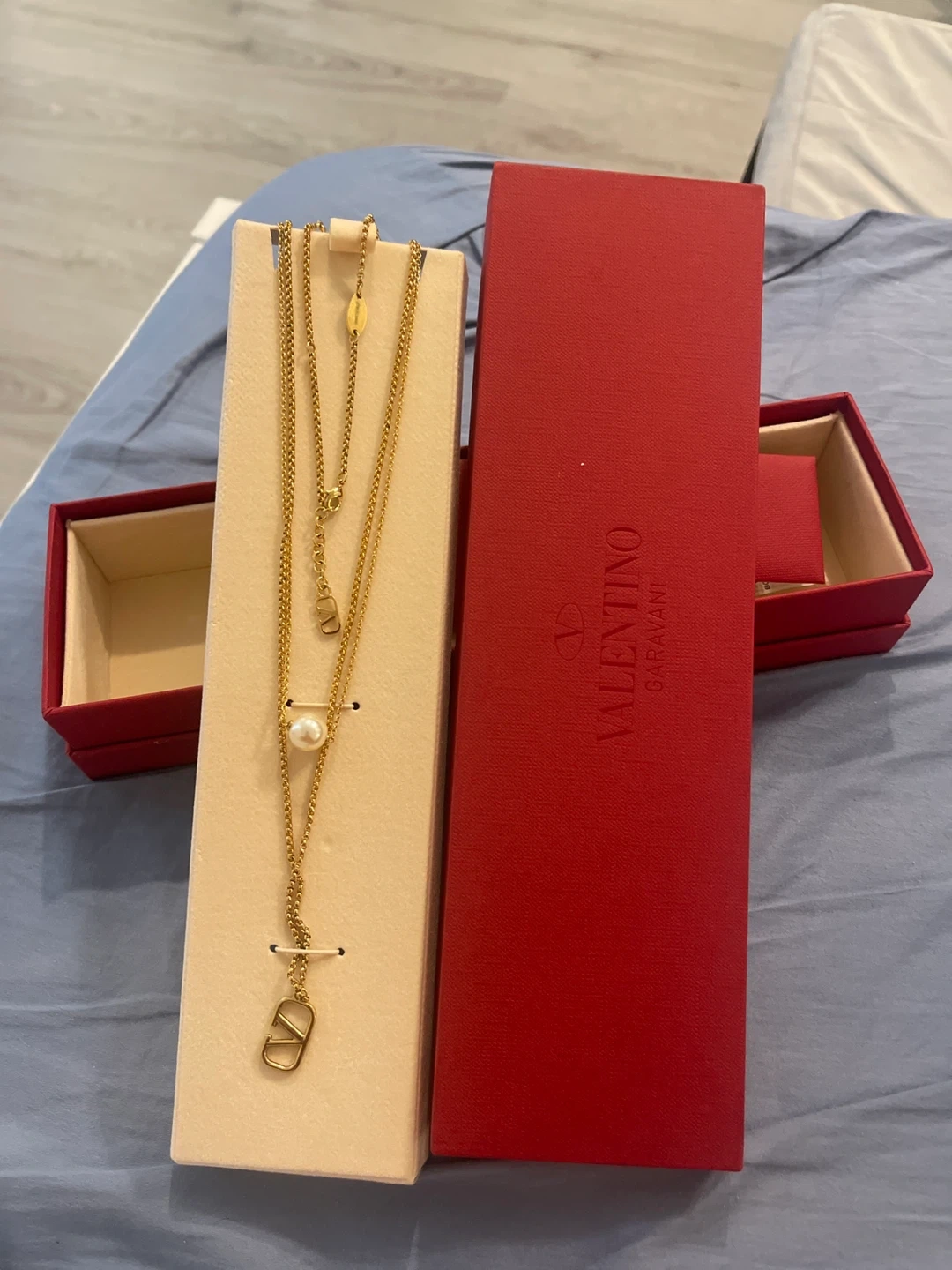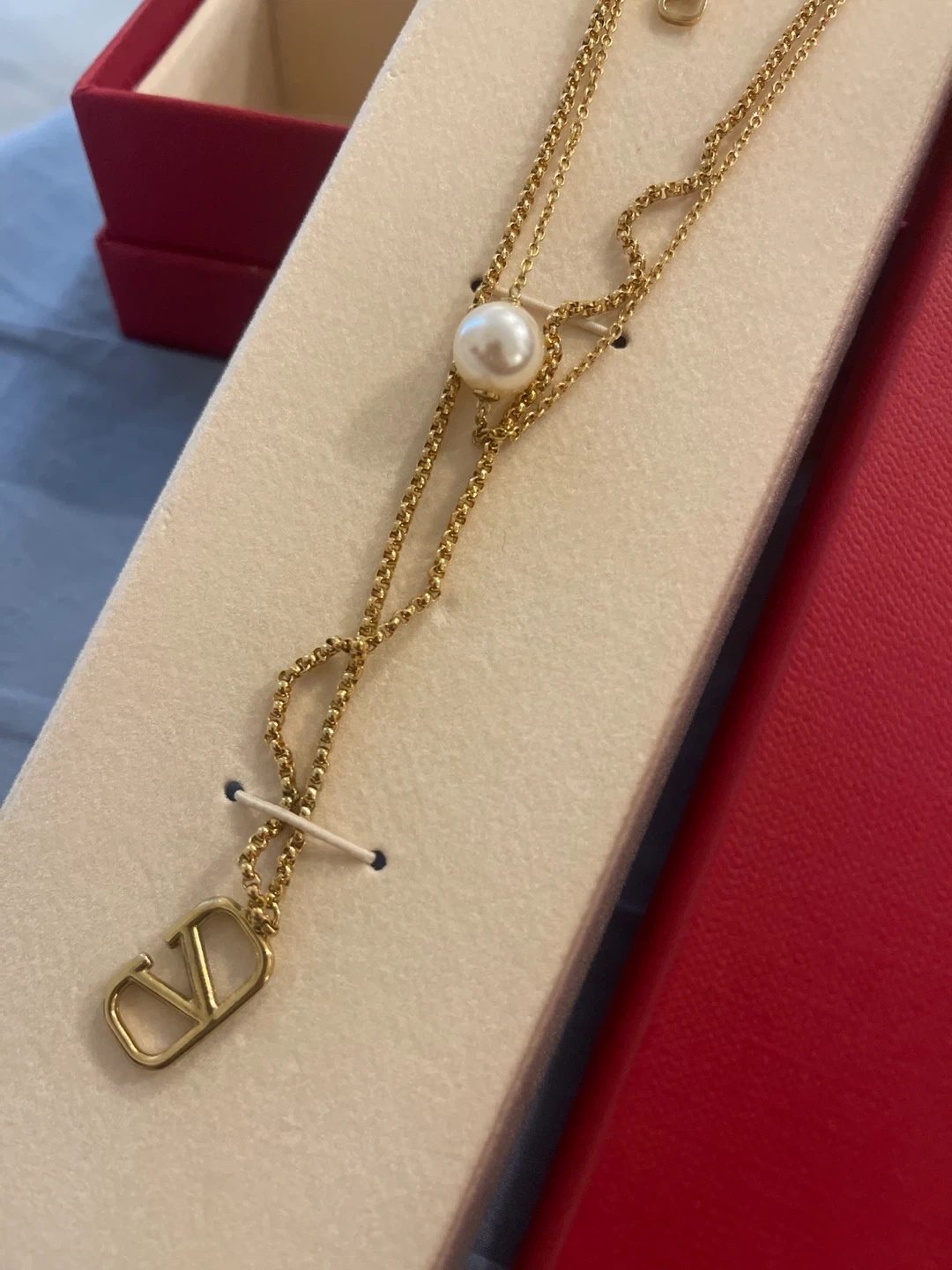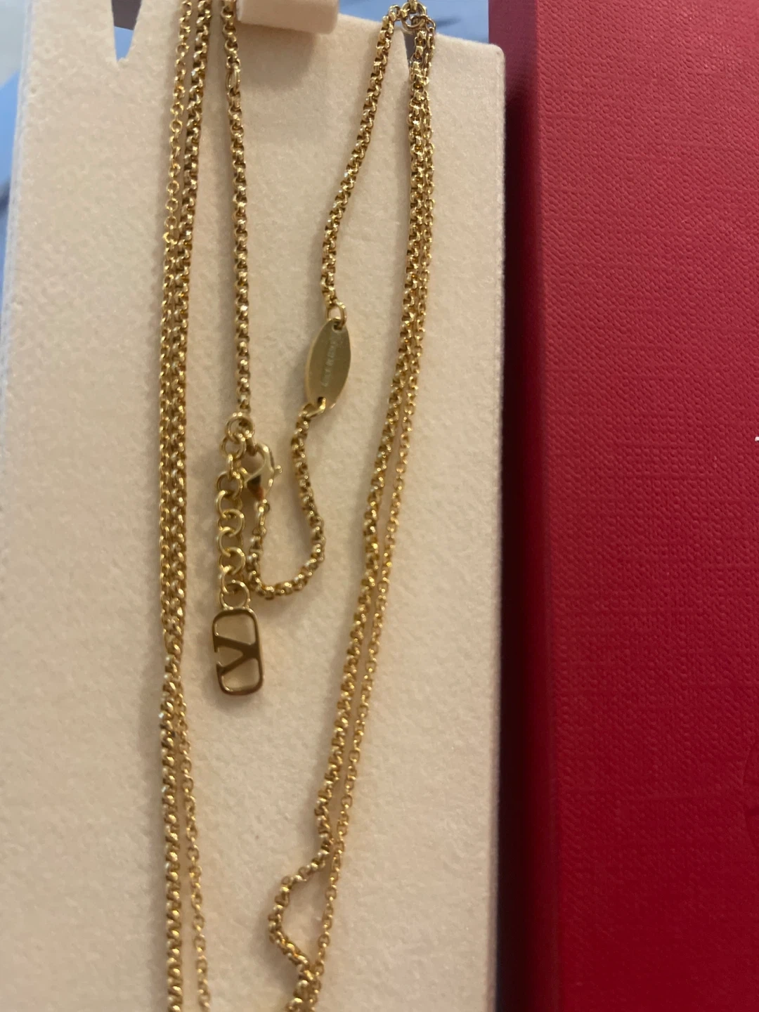 Selling a beautiful Valentino Garavani gold necklace. It's in excellent condition and comes with the original box, card and dust bag. The necklace features a layered design with a pearl accent and the iconic Valentino "V" logo. Perfect for adding a touch of luxury to any outfit!