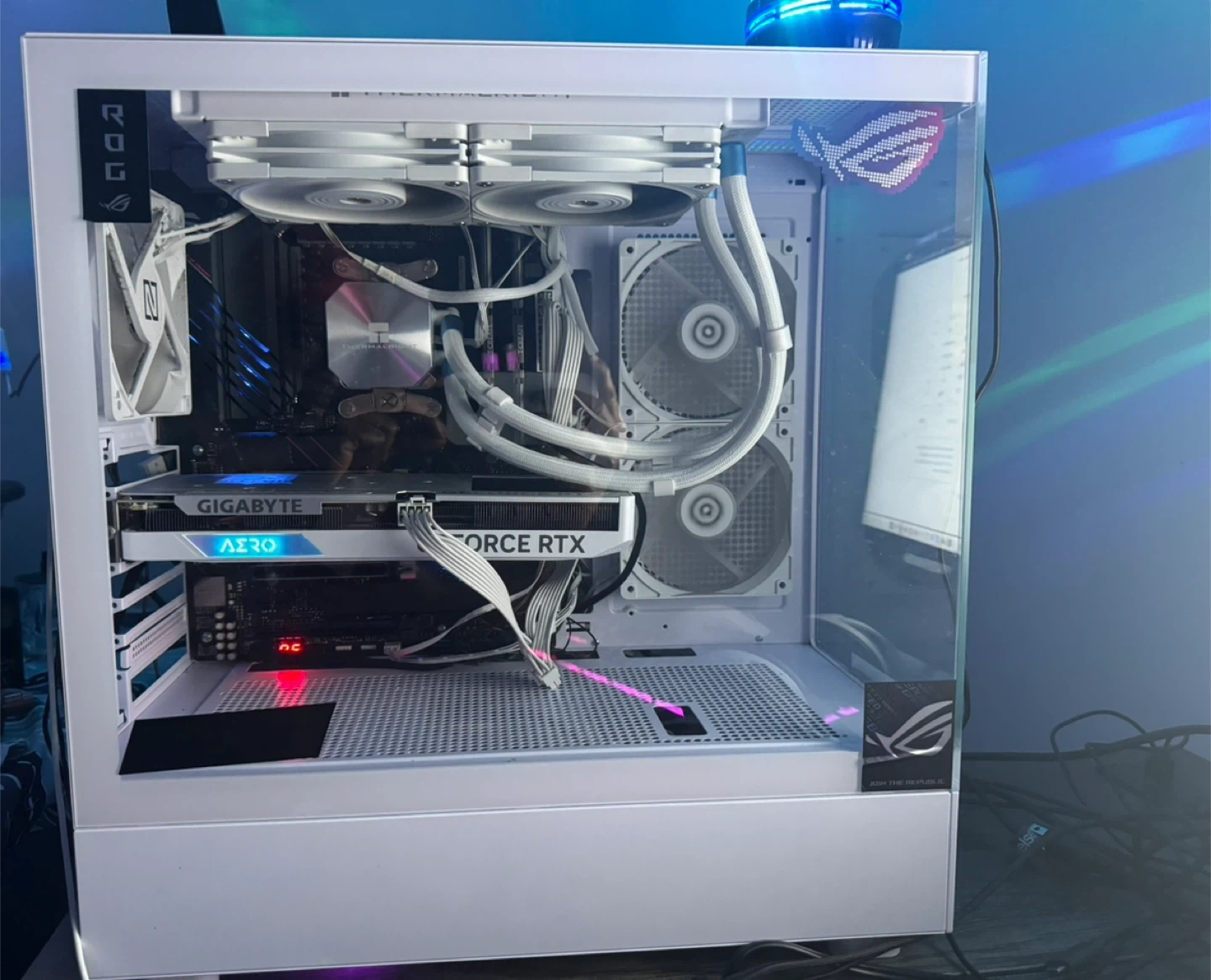 Selling a custom-built white gaming PC. It features a Gigabyte AERO GeForce RTX graphics card. ROG components are also included in the build. Great for gaming and other demanding tasks!