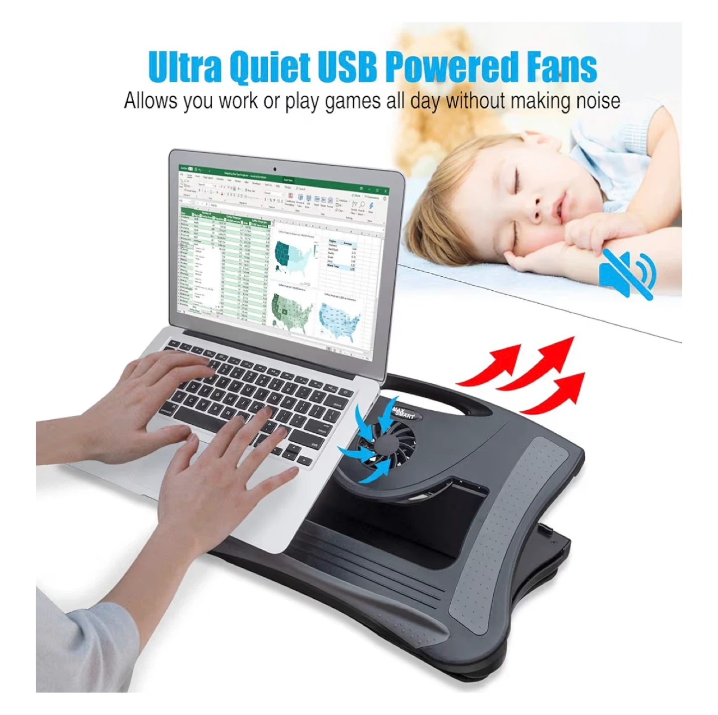It's compatible with laptops up to 15.6 inches and is ultra-quiet thanks to the USB-powered fans