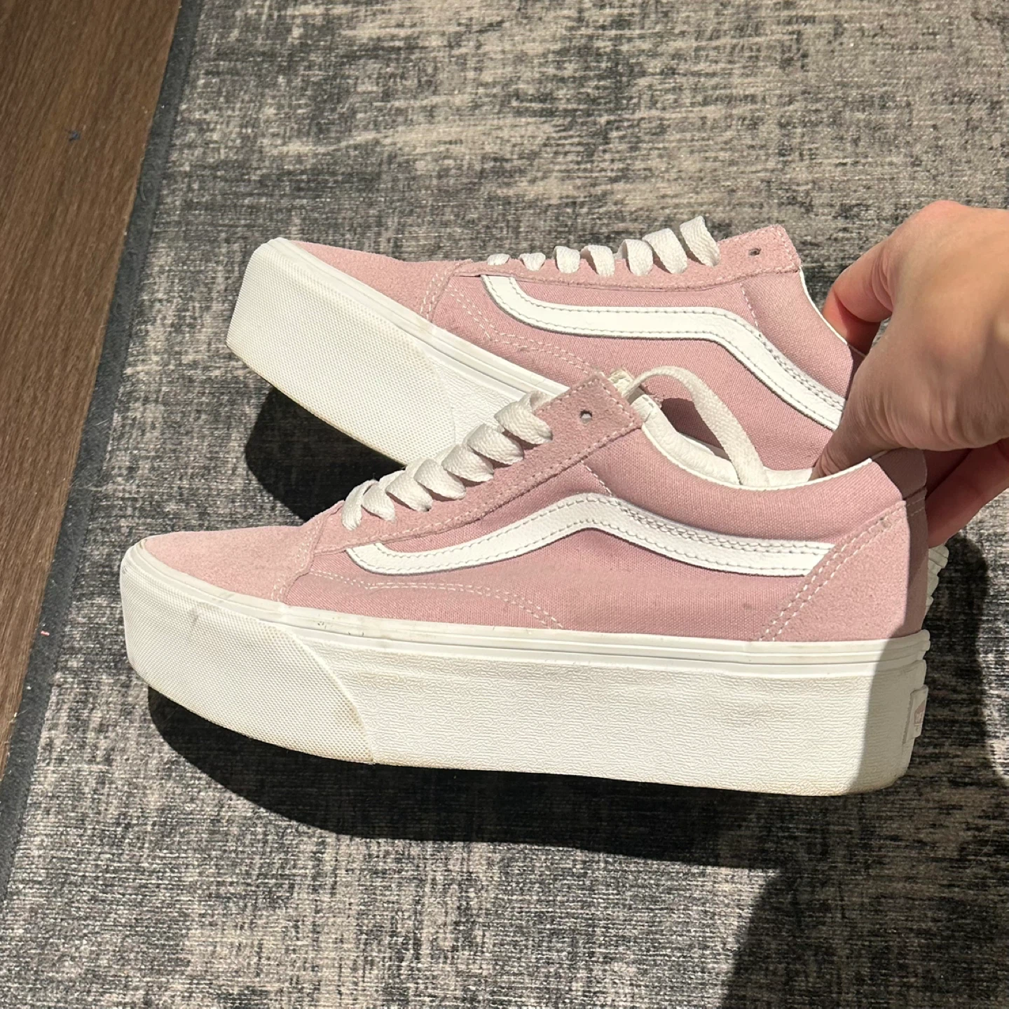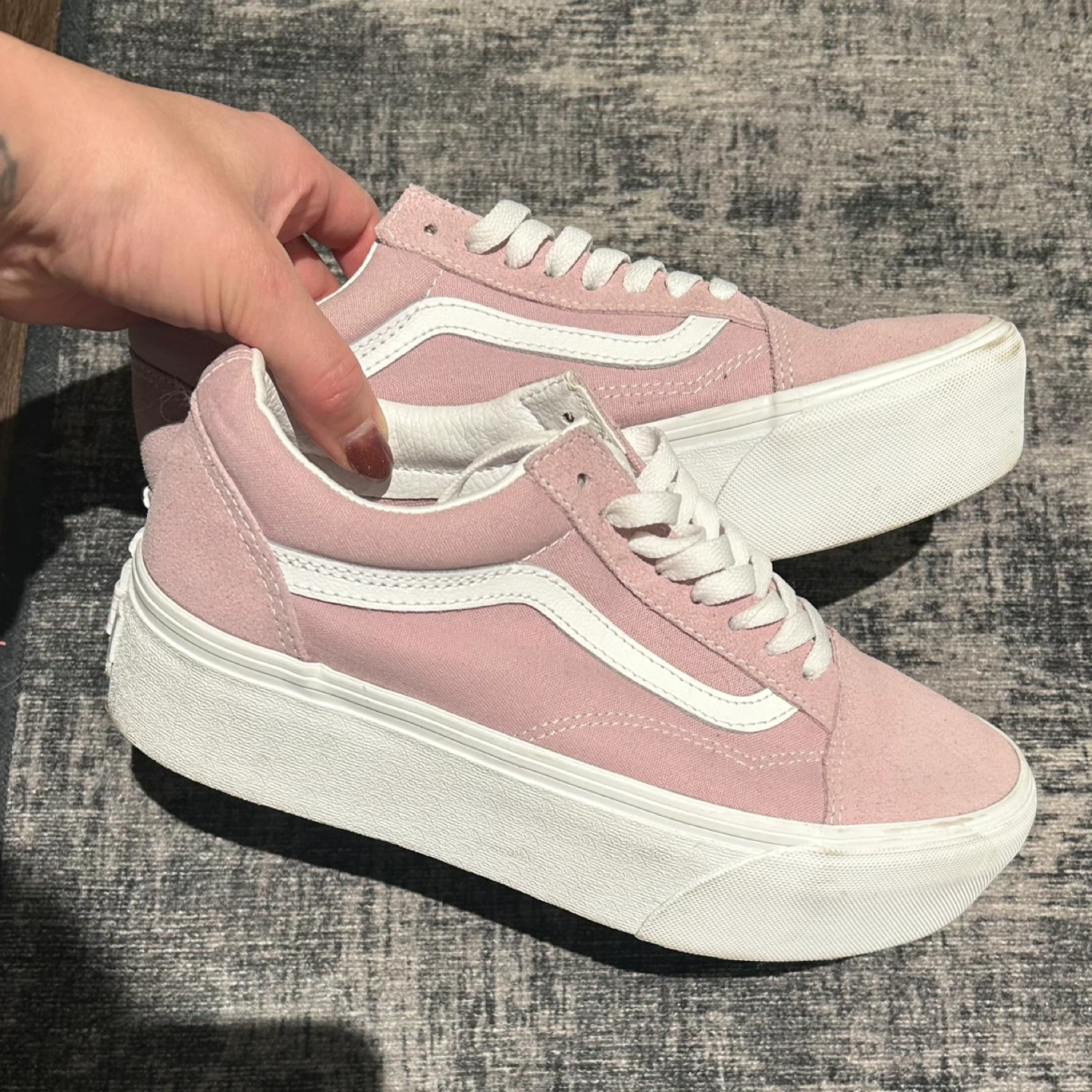 Size 8 pink platform Vans sneakers, suede toe and lace detailing. Worn once before realizing I’m not a platform sneaker girlie!