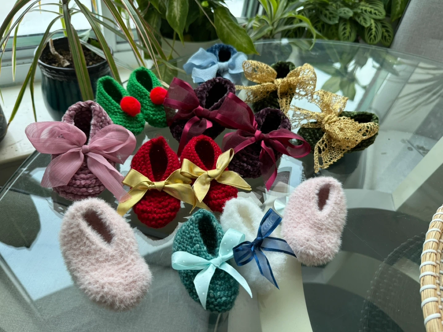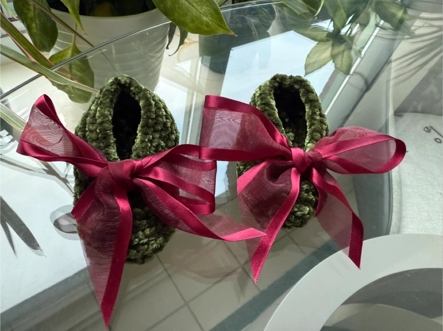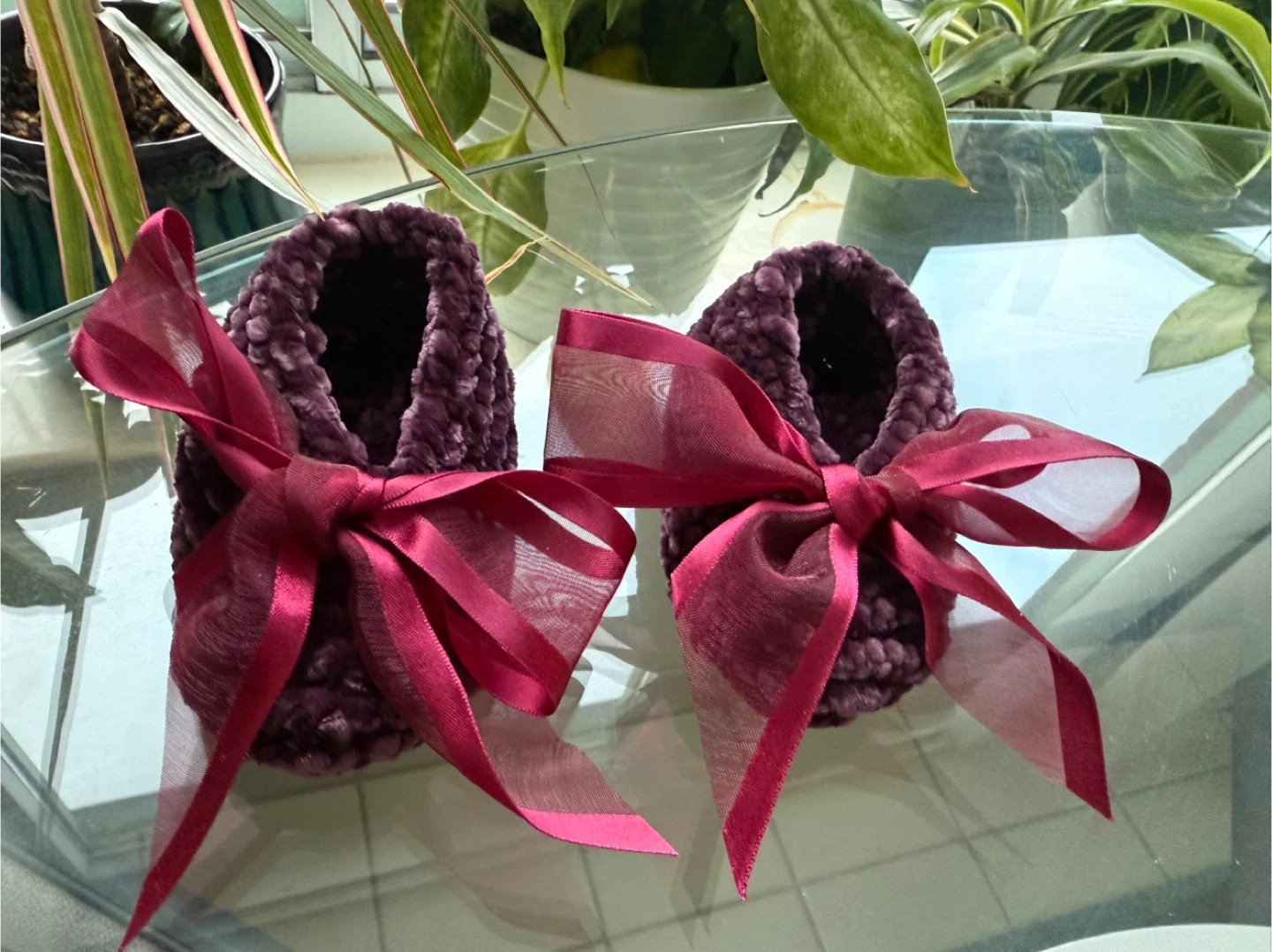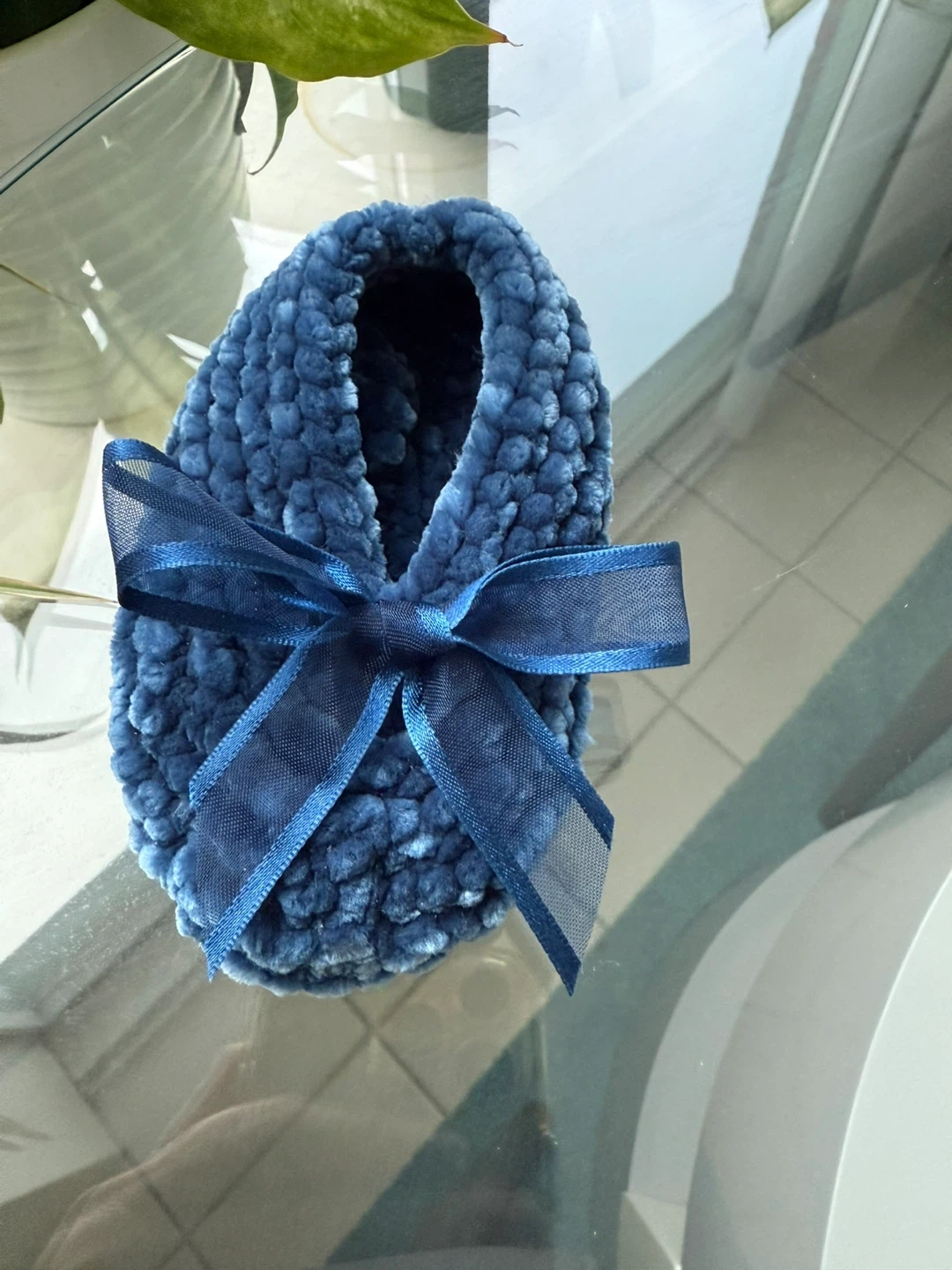 These adorable handmade crochet baby booties are brand new and ready for a little one! They're made with soft, cozy yarn and feature a cute ribbon detail. Perfect for keeping tiny toes warm and stylish