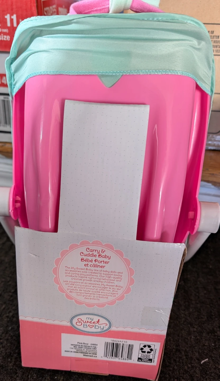 This is a My Sweet Baby Carry & Cuddle Baby doll and carrier. Ready for a new little one to play with! The carrier is pink and aqua, and the doll has blue eyes
