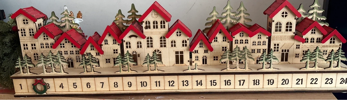 Wooden Christmas village advent calendar, lits up, battery needs to be replaced, 3 double A batteries π