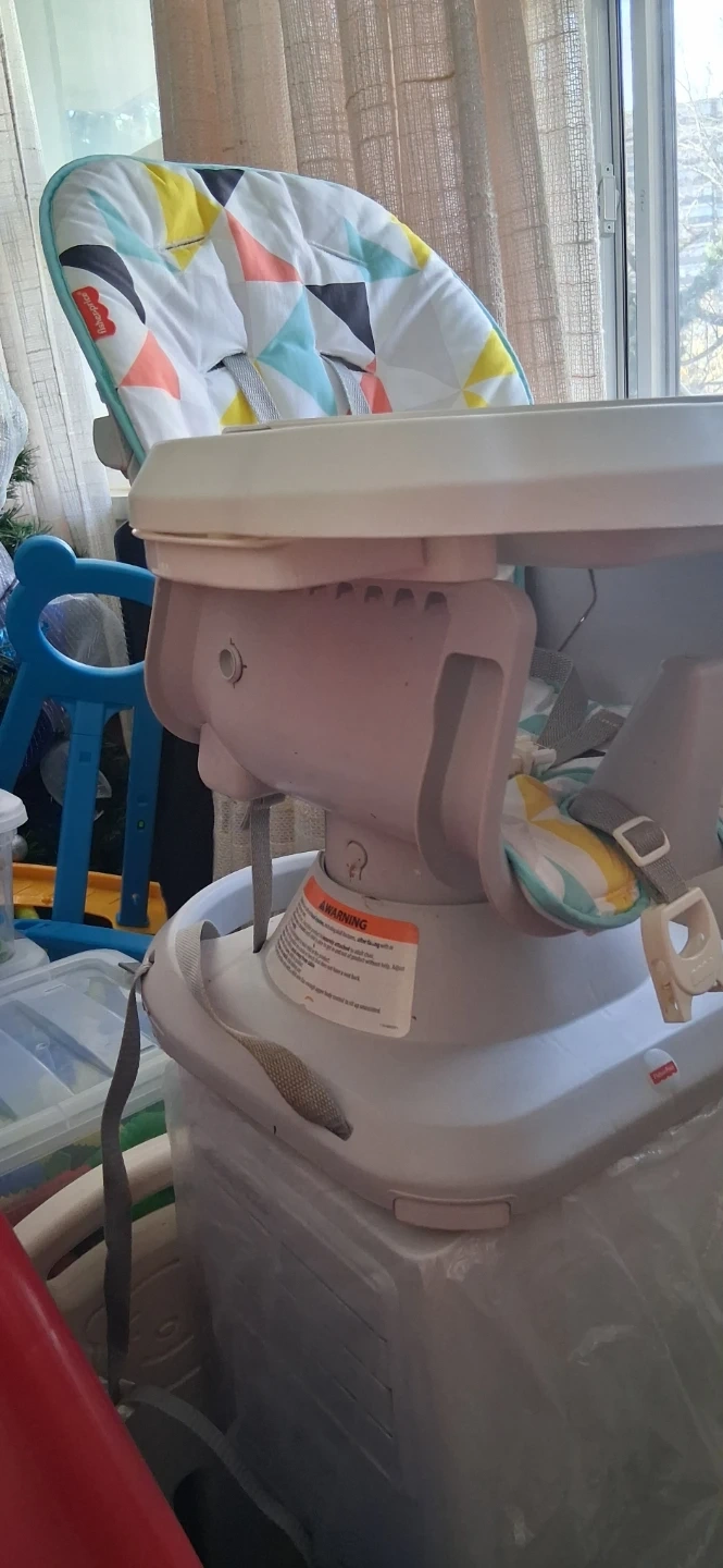 Selling a Fisher-Price high chair in good condition! The seat has a colourful geometric pattern. It's perfect for feeding time and keeping your little one secure and comfortable!