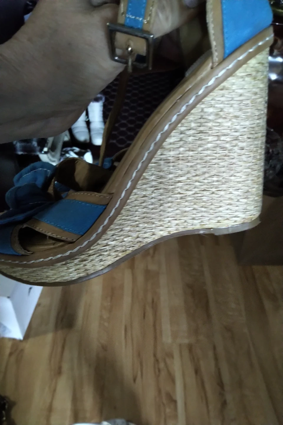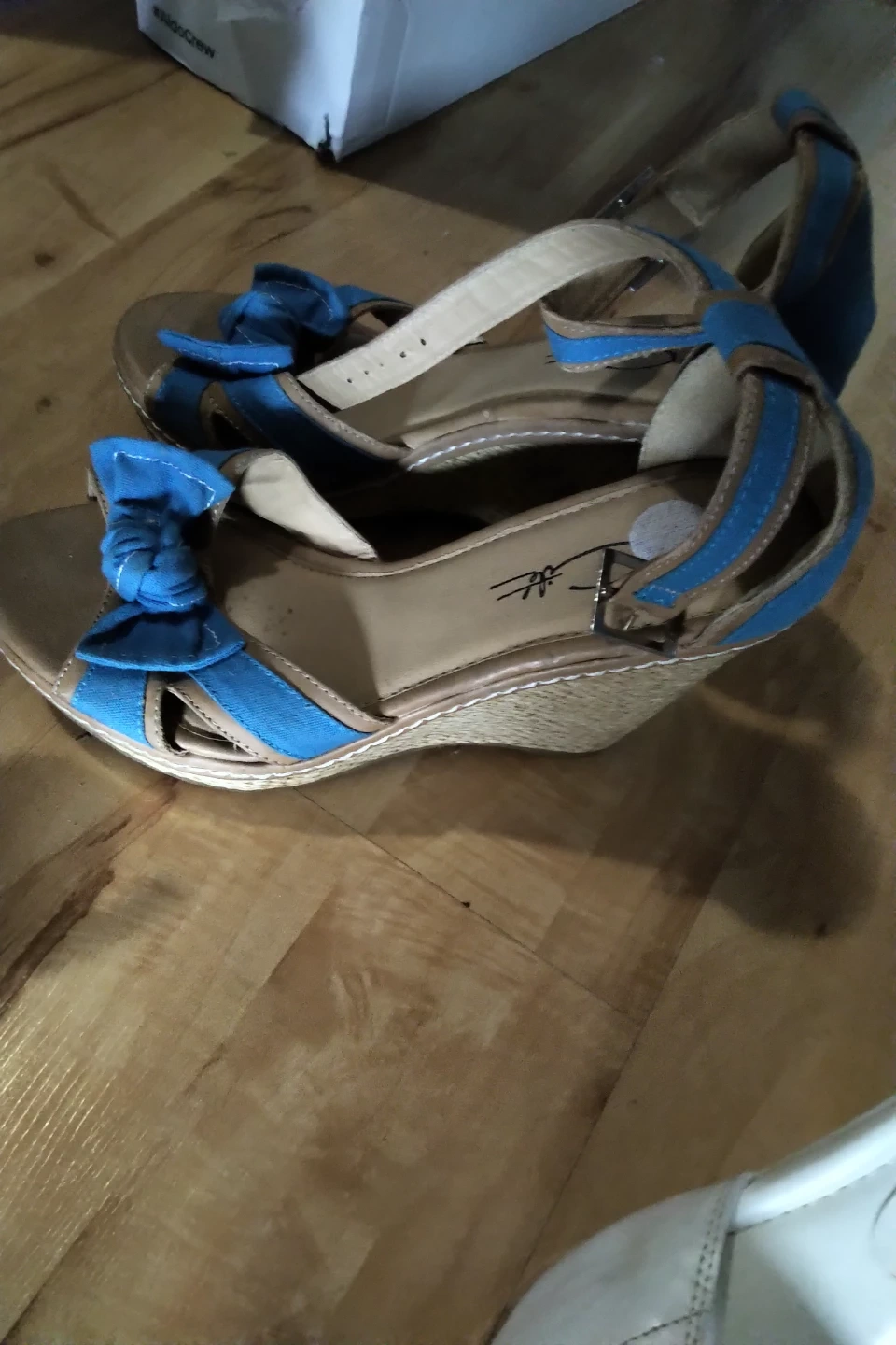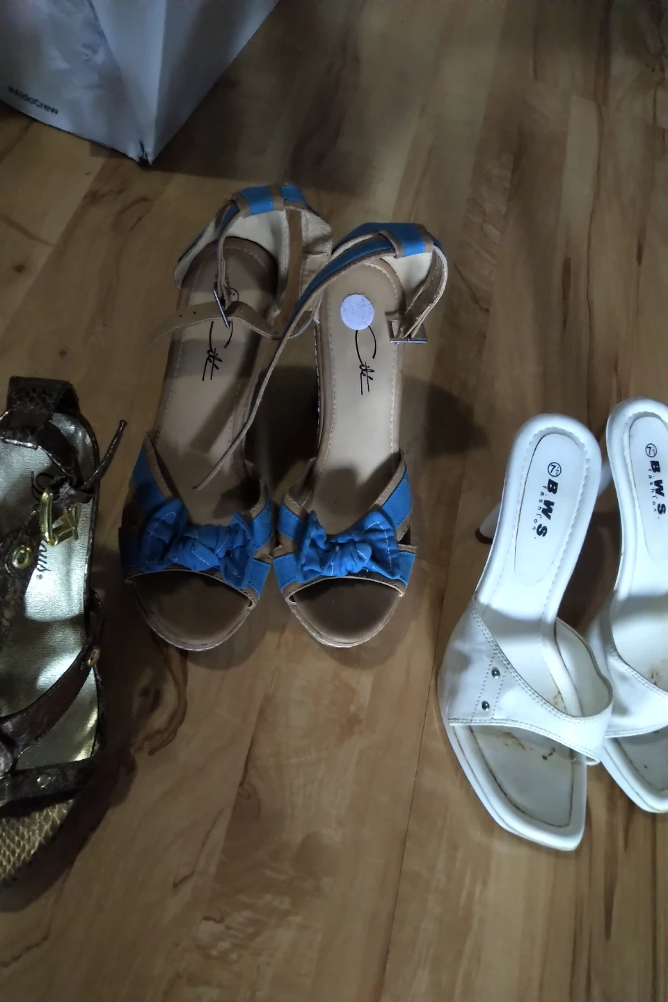 Selling a pair of white heels from BWS. They are in used condition but still have lots of life left! Pair of gold Cooper stylish heels!excellent condition. Pair of blue wedges with front bow-like New. All about size 7. Very clean and well taken care of ! All 3 for $3! HNY!! Pick up is Weston@401 May accommodate @various locations within distance. Ty.